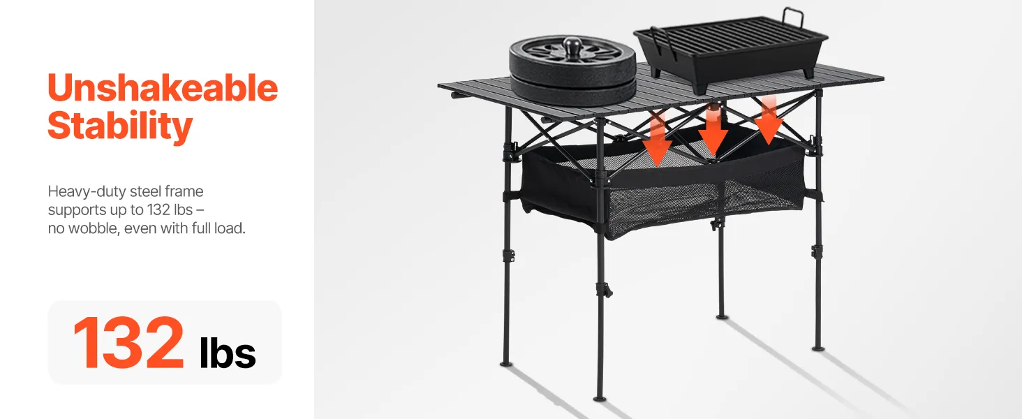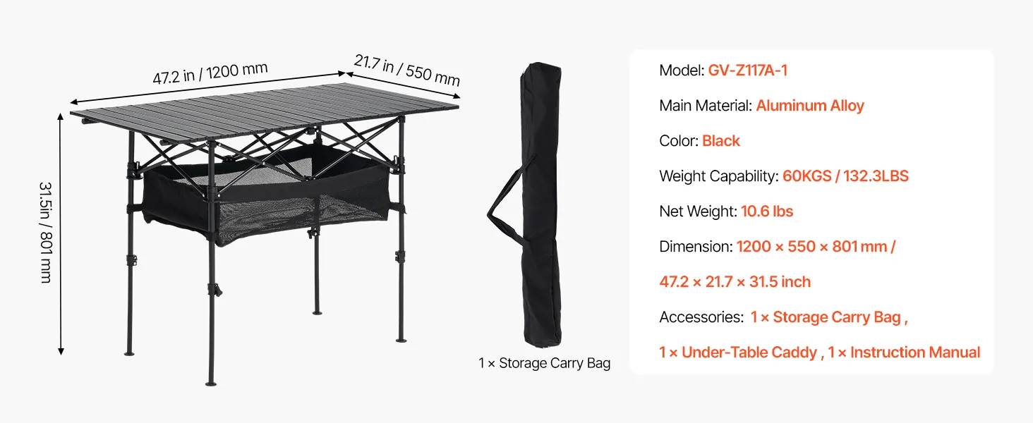 Otázka: Aké sú rozmery stolovej dosky?Odpoveď: Stolová doska má rozmery 47,2 × 21,7 palca (1 200 × 550 mm) a poskytuje dostatok priestoru na jedlo, vybavenie alebo aktivity.Otázka: Akú hmotnosť unesie stôl? Je stabilný?Odpoveď: Stôl unesie až 132 libier (60 kg) a má robustný rám s nohami, ktoré sú odolné voči kývaniu.Otázka: Koľko stôl váži? Je ľahko prenosný?Stôl je ľahký, váži 4,8 kg, kompaktne sa skladá a ľahko sa prenáša pomocou priloženej úložnej tašky.Otázka: Je potrebná montáž? Aká je zložitá?Odpoveď: Nie je potrebné žiadne náradie - pri montáži stačí postupovať podľa priloženého návodu na montáž. Nastavenie je rýchle a intuitívne pre každého.