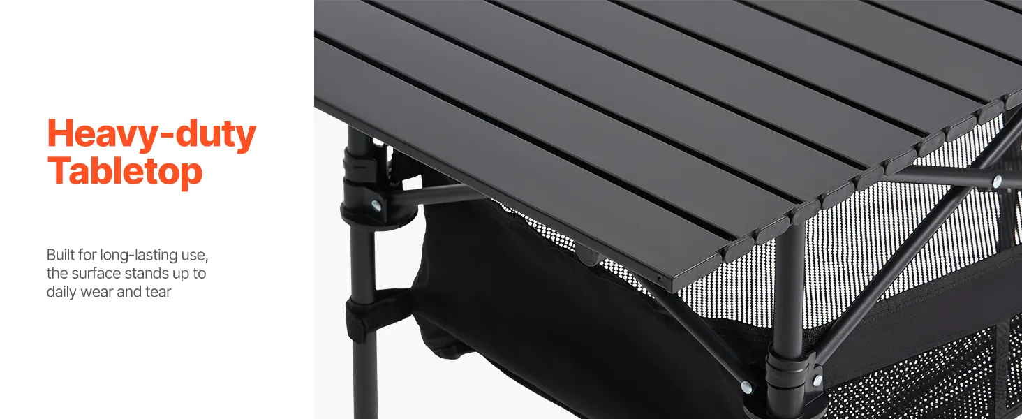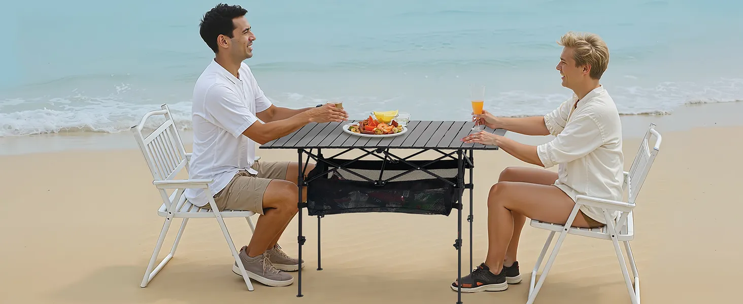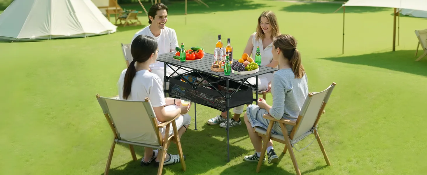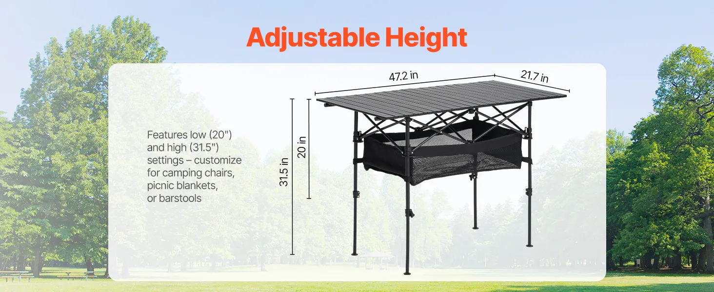 Skladací kempingový stôl z hliníka, nastaviteľná výška, s taškou