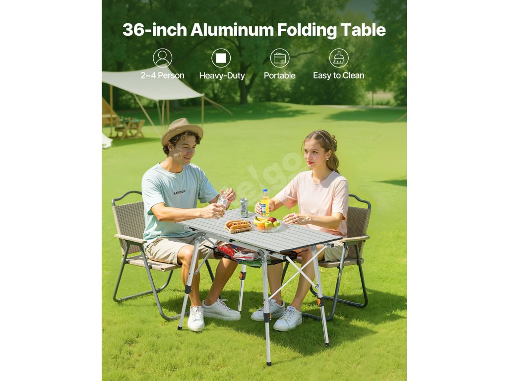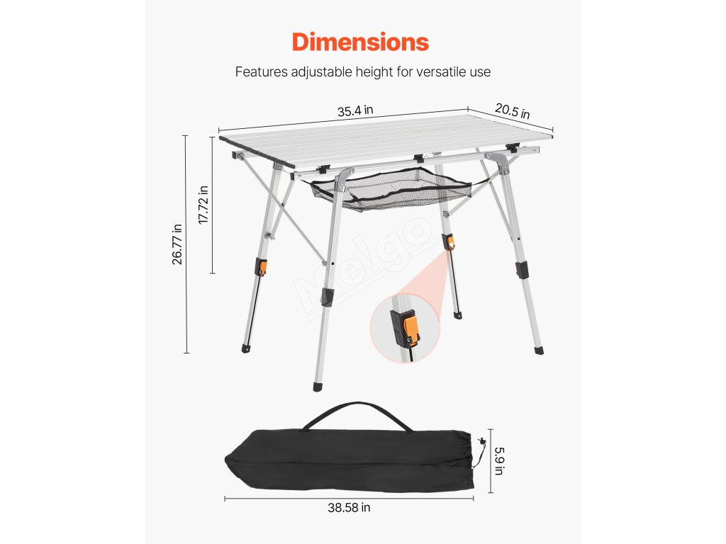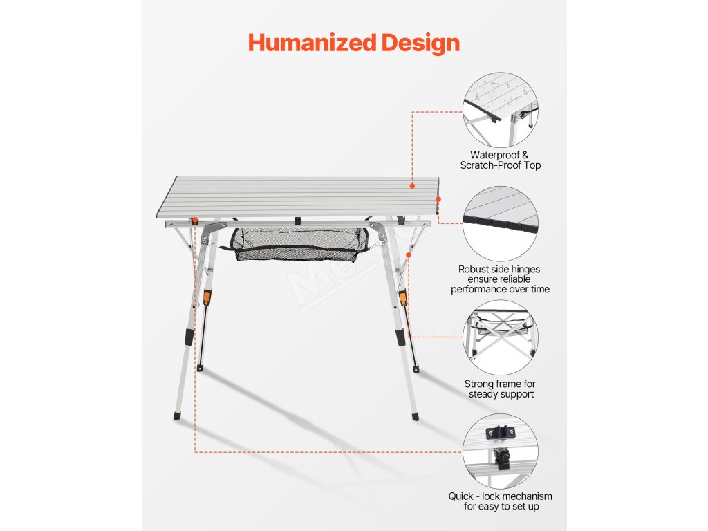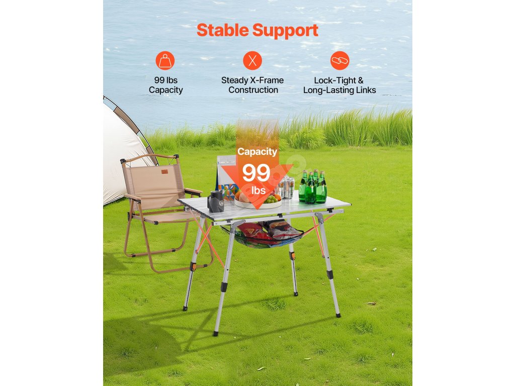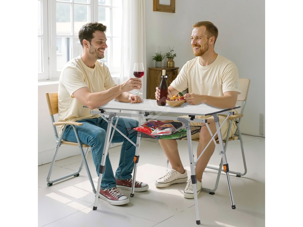 Skladací kempingový stôl z hliníka, nastaviteľná výška, sieťka
