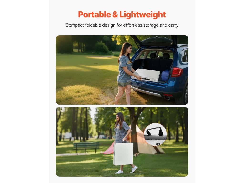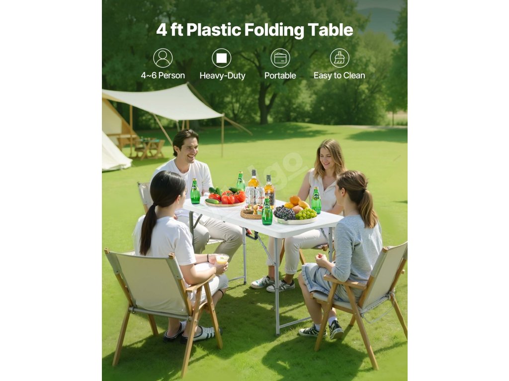 Otázka: Aké sú rozmery stolovej dosky?Odpoveď: Stolová doska meria 4 stopy (48 palcov / 122 cm), čo poskytuje dostatok priestoru na jedlá, vybavenie alebo aktivity.Otázka: Akú hmotnosť unesie stôl? Je stabilný?Odpoveď: Stôl unesie až 220 libier (100 kg) a má robustný rám s nohami, ktoré sú odolné voči kolísaniu.Otázka: Koľko stôl váži? Odpoveď: Stôl je ľahký, váži 17,6 libier/ 8 kg a dá sa kompaktne zložiť, takže sa dá ľahko prenášať pomocou zabudovanej rukoväte a uložiť do kufra auta alebo do skrine.Otázka: Je potrebná montáž? Odpoveď: Nie je potrebné žiadne náradie - pri montáži sa jednoducho riaďte priloženým návodom na montáž. Nastavenie je rýchle a intuitívne pre každého.