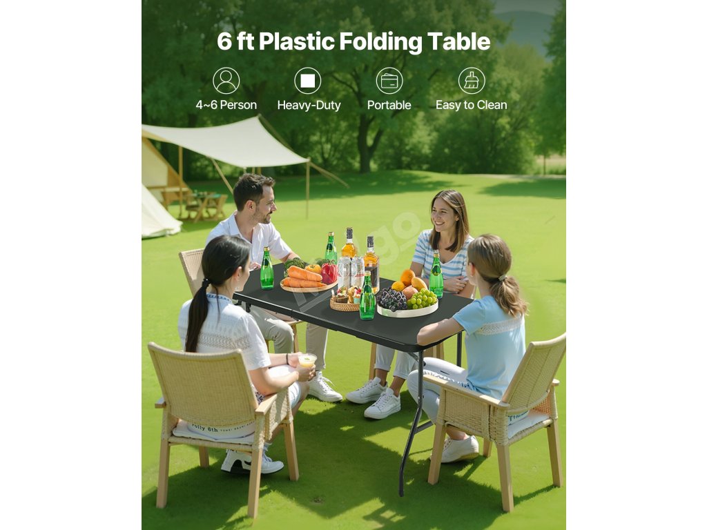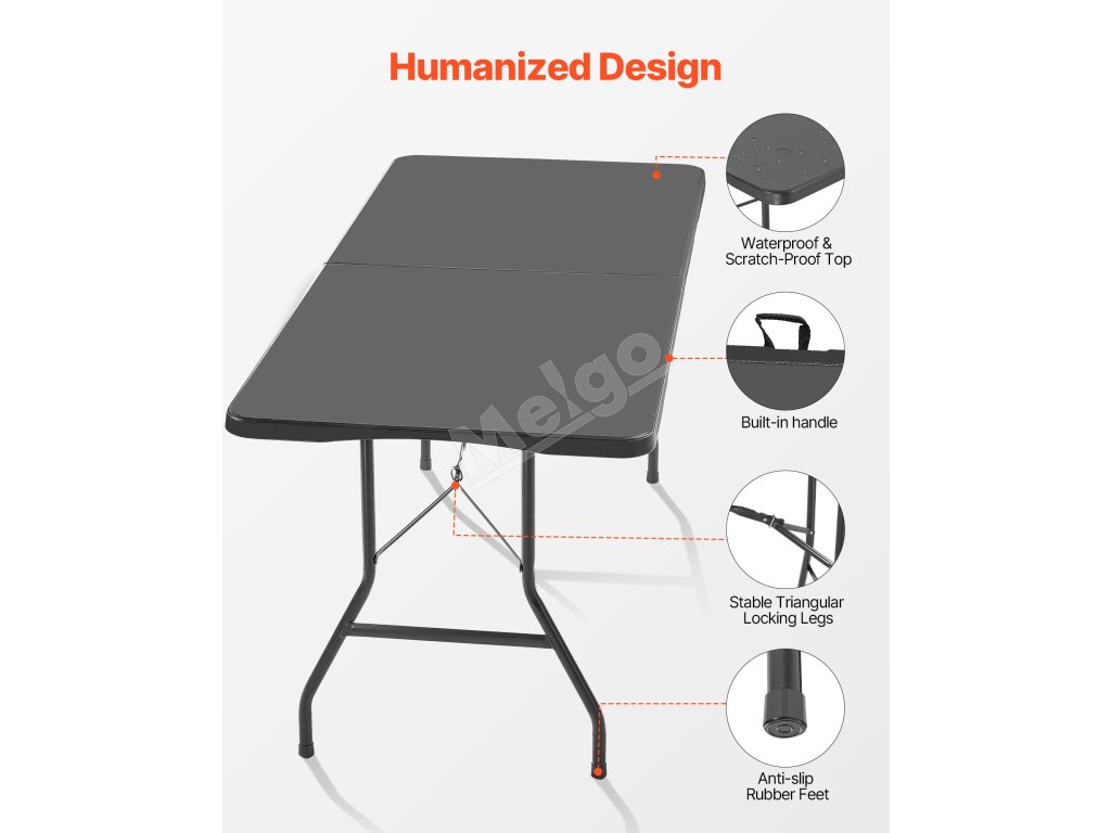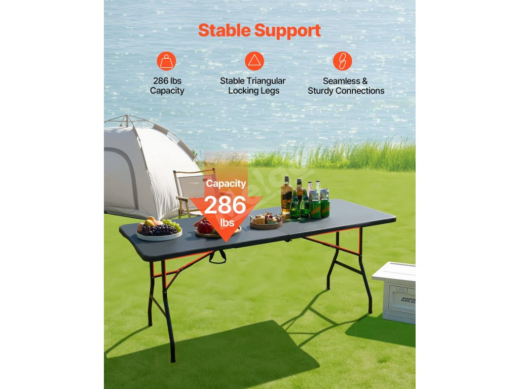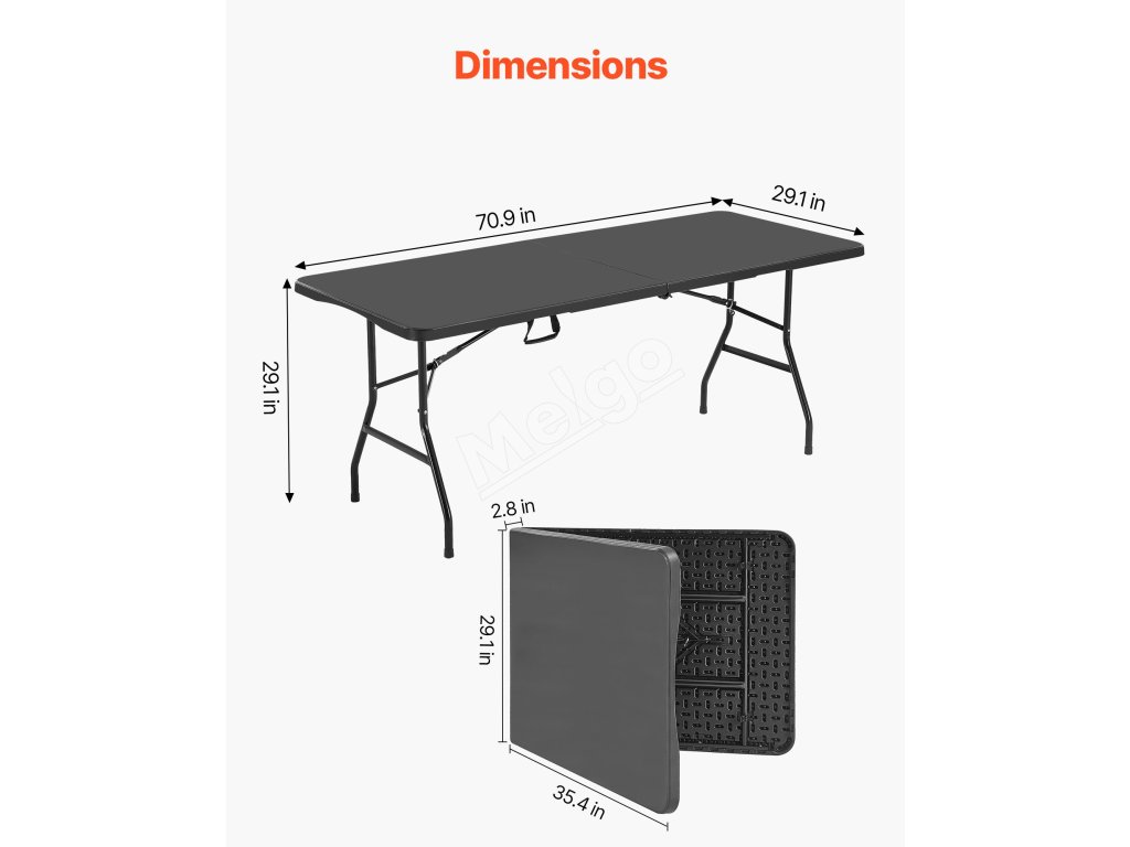 Otázka: Aké sú rozmery stolovej dosky?Odpoveď: Stolová doska meria 6 stôp (71 palcov/180 cm), čo poskytuje dostatok priestoru na jedlá, vybavenie alebo aktivity.Otázka: Akú hmotnosť unesie stôl? Je stabilný?Odpoveď: Stôl unesie až 287 libier (130 kg) a má robustný rám s nohami, ktoré odolávajú kolísaniu.Otázka: Koľko stôl váži? Odpoveď: Stôl je ľahký, váži 22,9 libier/ 10,4 kg a dá sa kompaktne zložiť, takže sa dá ľahko prenášať pomocou zabudovanej rukoväte a uložiť do kufra auta alebo skrine.Otázka: Je potrebná montáž? Odpoveď: Nie je potrebné žiadne náradie - pri montáži jednoducho postupujte podľa priloženého návodu na montáž. Nastavenie je rýchle a intuitívne pre každého.
