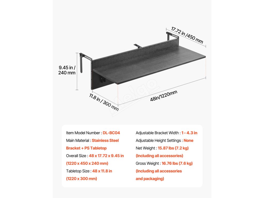 Závesný skladací balkónový stôl 12×48" max 50 lbs na zábradlie 1"–4.3"