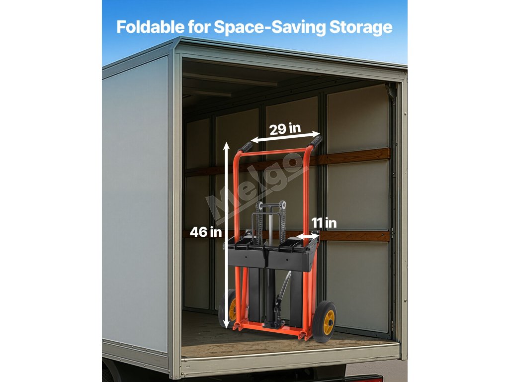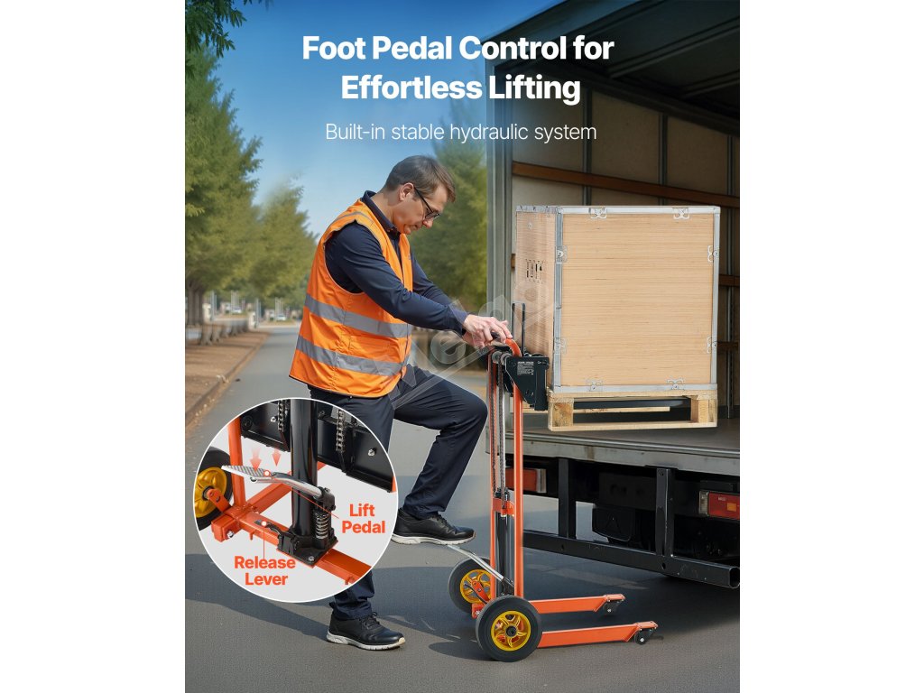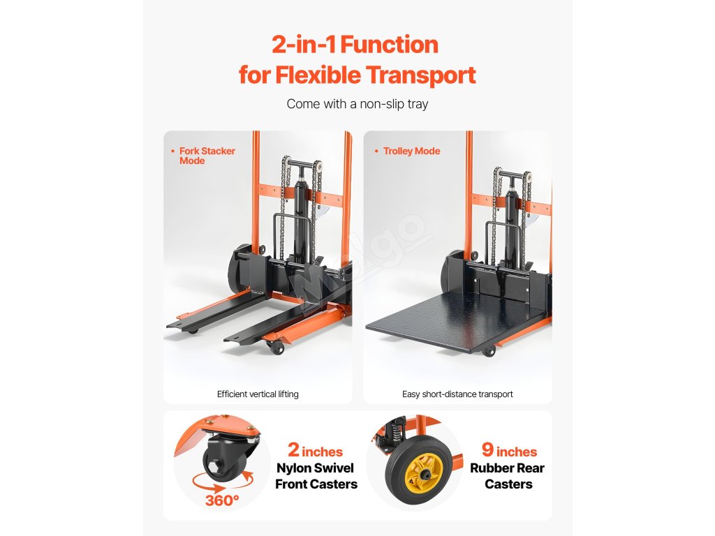 Prepínajte medzi režimami zdvíhacieho a ručného vozíka! Bez námahy premiestňujte ťažké bremená pomocou dvoch odolných 9-palcových zadných kolies a dvoch 2-palcových predných kolies. Náš paletový zakladač je ideálny na plynulú prepravu na akomkoľvek povrchu.