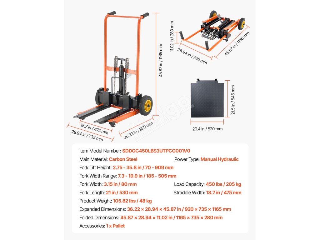 Ľahko premiestnite až 450 libier (205 kg)! Vďaka 35,8-palcovej výške zdvihu a 2,75-palcovej zníženej výške vidlíc navijakového nakladača je manipulácia s ťažkým tovarom hračkou. Nastaviteľné vidlice a priečne nohy pomáhajú pri flexibilných prepravných úlohách.
