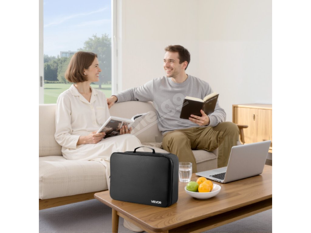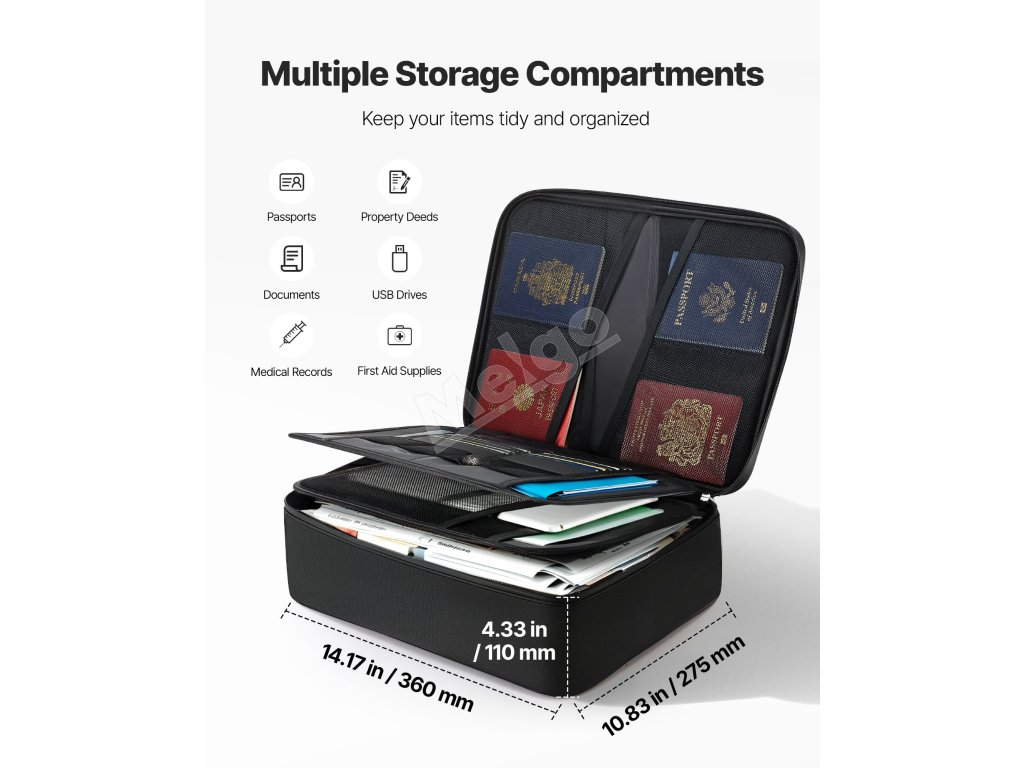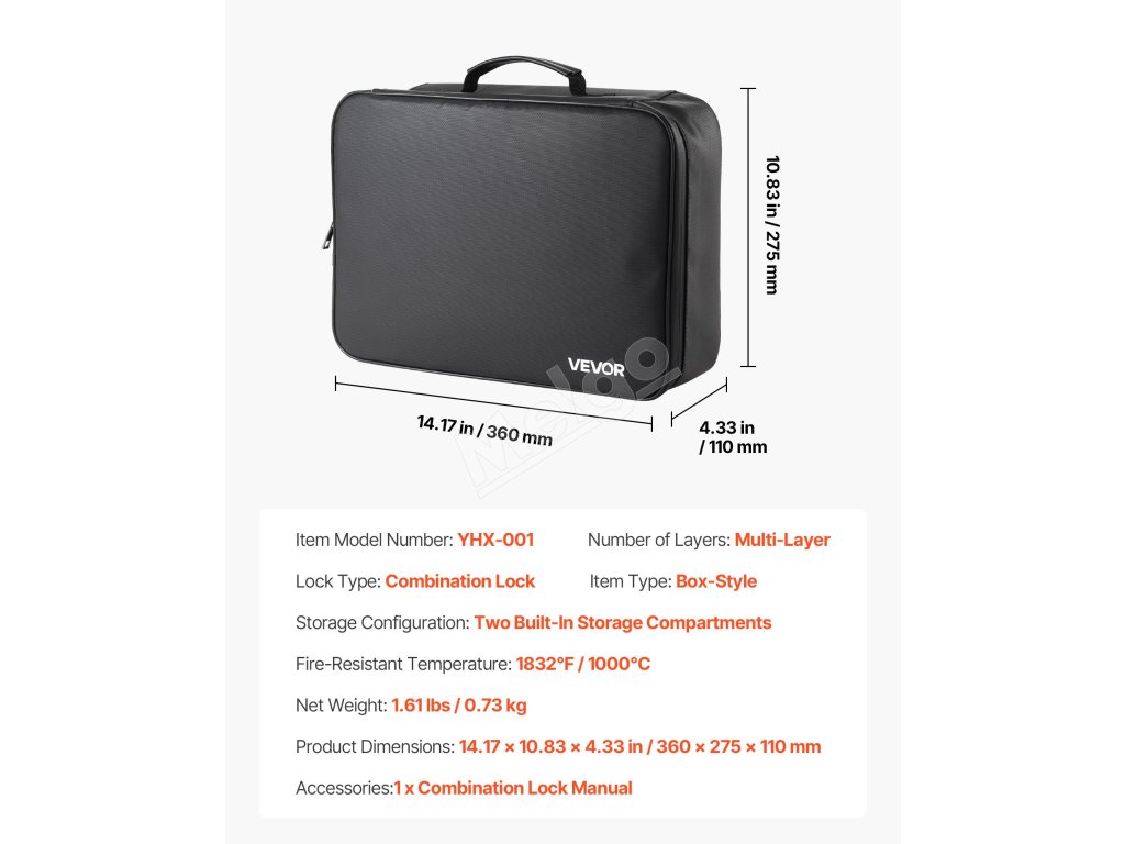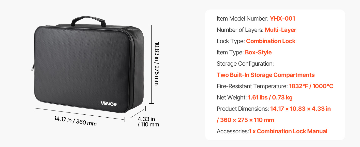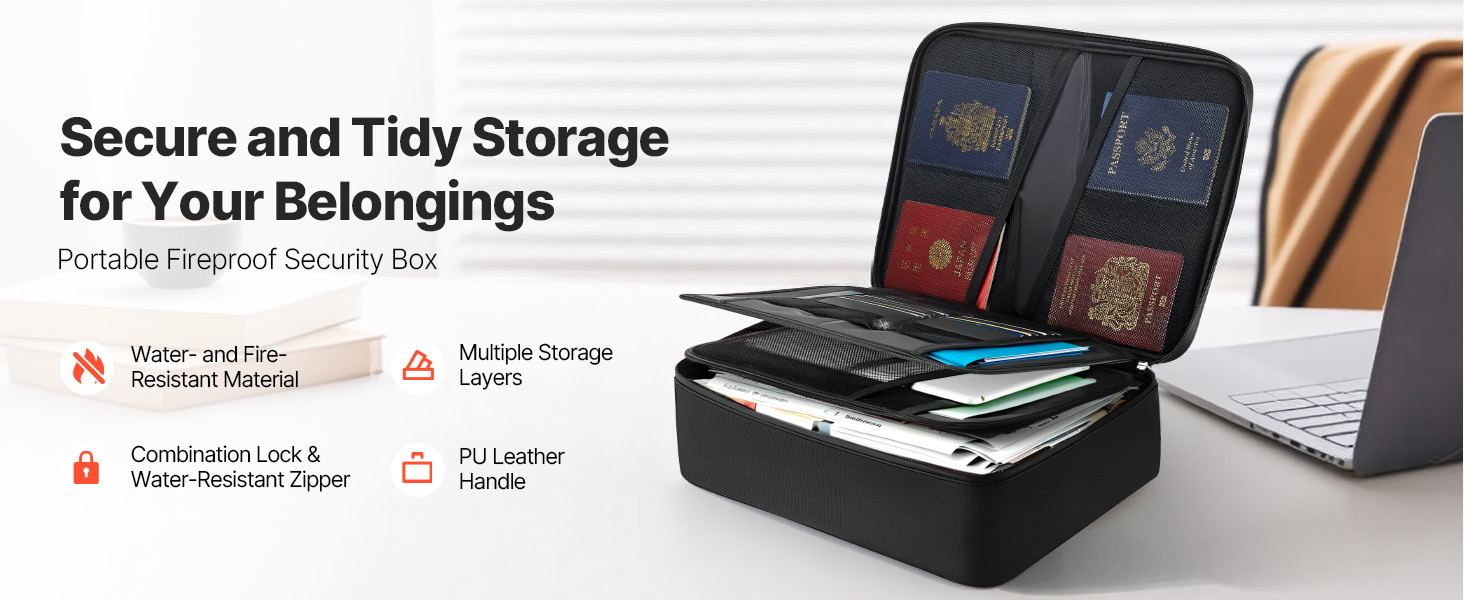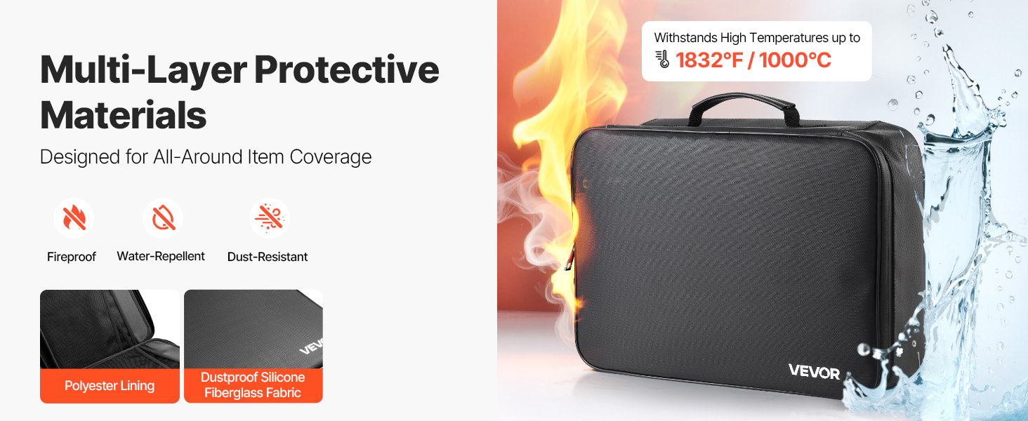 Táto prenosná ohňovzdorná schránka využíva žiaruvzdorný materiál, ktorý odolá 1832℉/1000 ℃, a navyše je odolná voči vode a prachu. S hmotnosťou iba 1,61 lbs/0,73 kg ponúka viacvrstvové ukladanie súborov a zariadení. Kombinovaný zámok a vodotesný zips zvyšujú bezpečnosť pri používaní doma, v kancelárii alebo v aute.