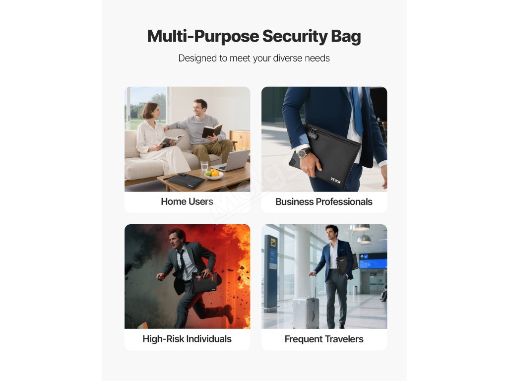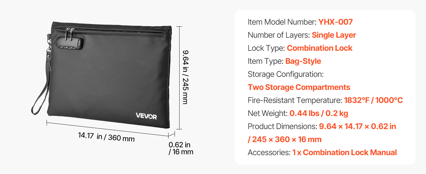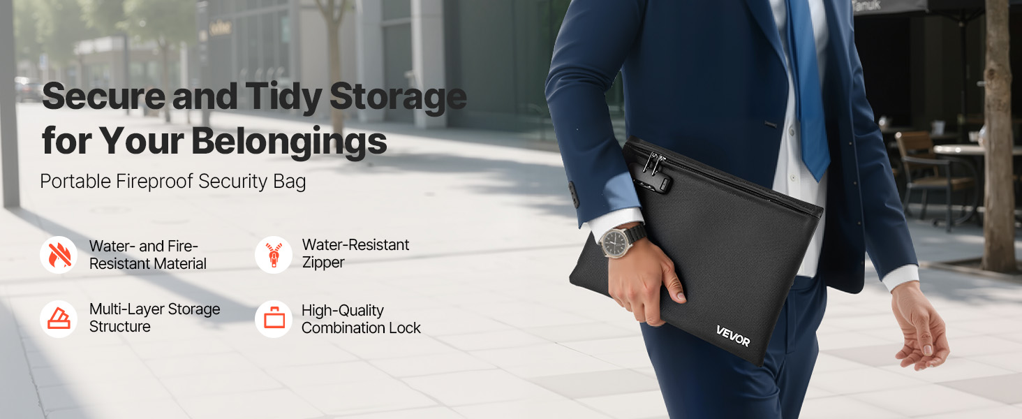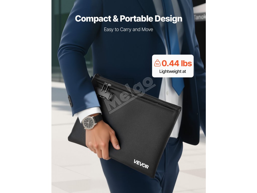 Táto ohňovzdorná taška odolá 1832℉/1000℃ a udrží vodu a prach mimo dosahu. S hmotnosťou len 0,44 lbs/0,2 kg organizuje súbory a zariadenia pomocou vrstveného dizajnu. Kombinovaný zámok a vodotesný zips zvyšujú bezpečnosť cenností doma, v kancelárii alebo v aute.