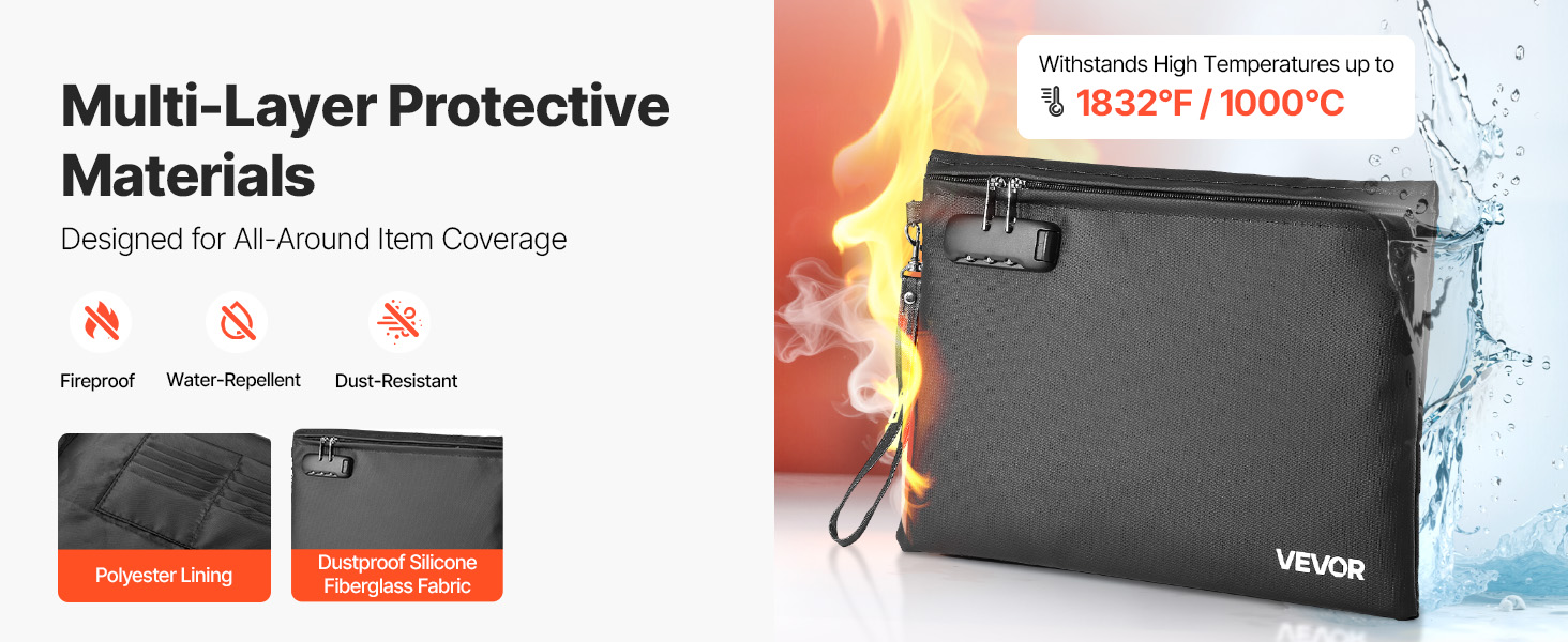 Naša ohňovzdorná taška je vyrobená z prachotesnej tkaniny zo sklených silikónových vlákien s polyesterovou podšívkou, ktorá vydrží až 1832℉/1000 ℃. Požiar, silný dážď ani každodenný prach neovplyvnia uloženie súborov a zariadení, čím poskytnú vašim cennostiam stálu a spoľahlivú všestrannú starostlivosť.