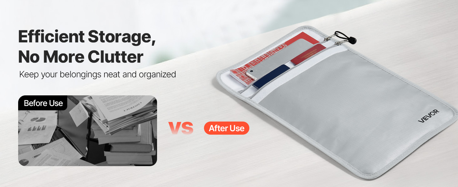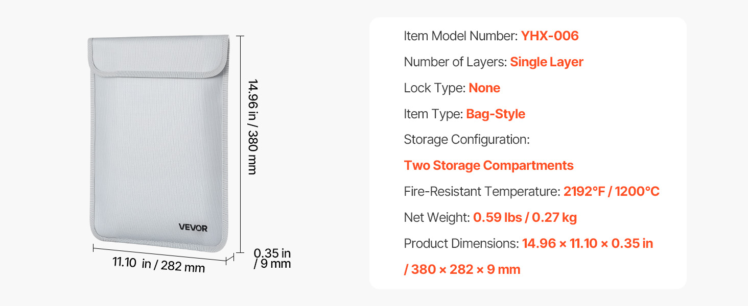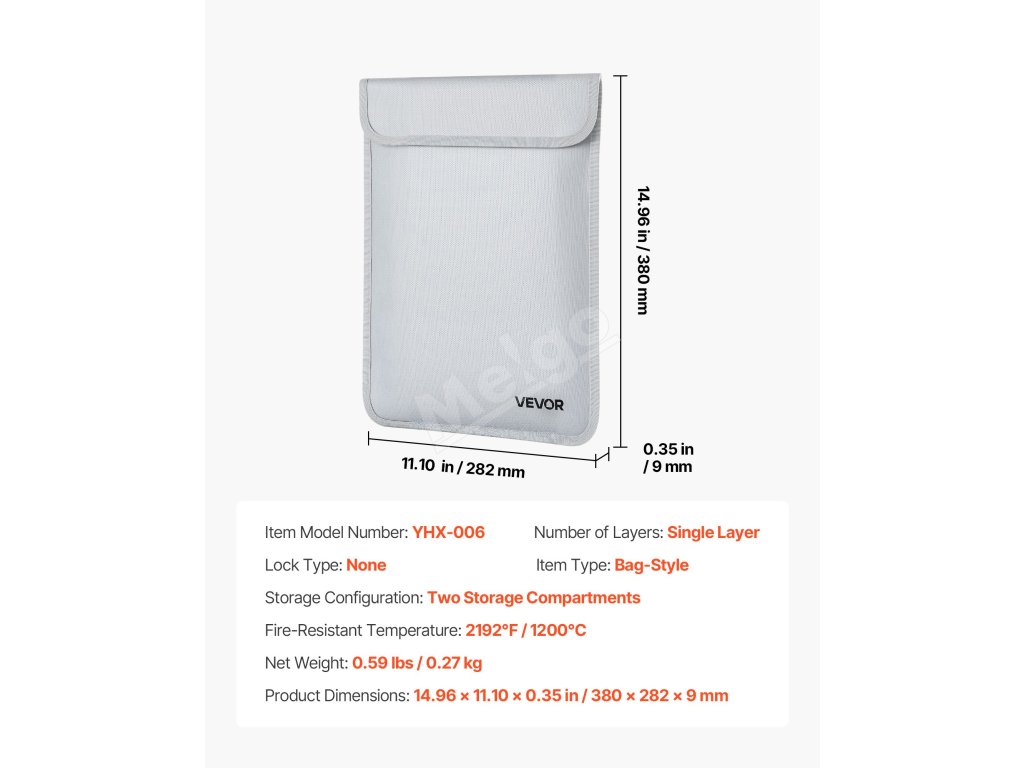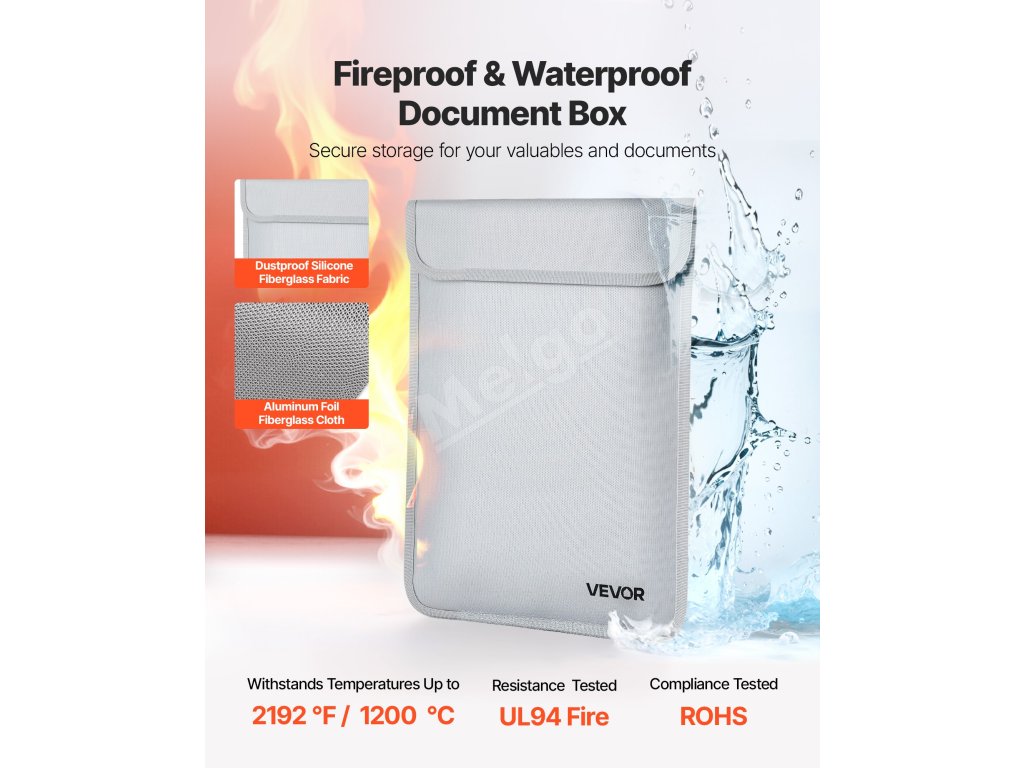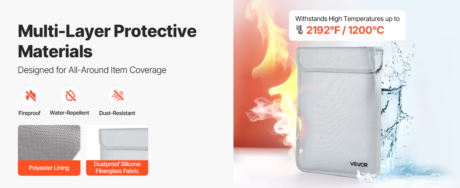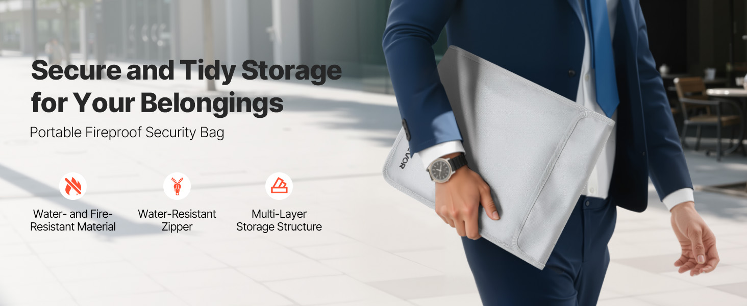 Táto ohňovzdorná taška odolá 2192℉/1200 ℃ a utesňuje vodu a prach. S hmotnosťou len 0,59 lbs/0,27 kg ponúka vrstvené úložisko pre súbory a zariadenia. Vylepšený vodotesný zips udrží predmety v suchu, takže je užitočná doma, v kancelárii alebo na cestách.