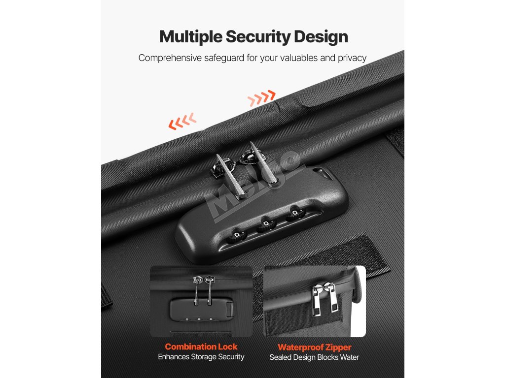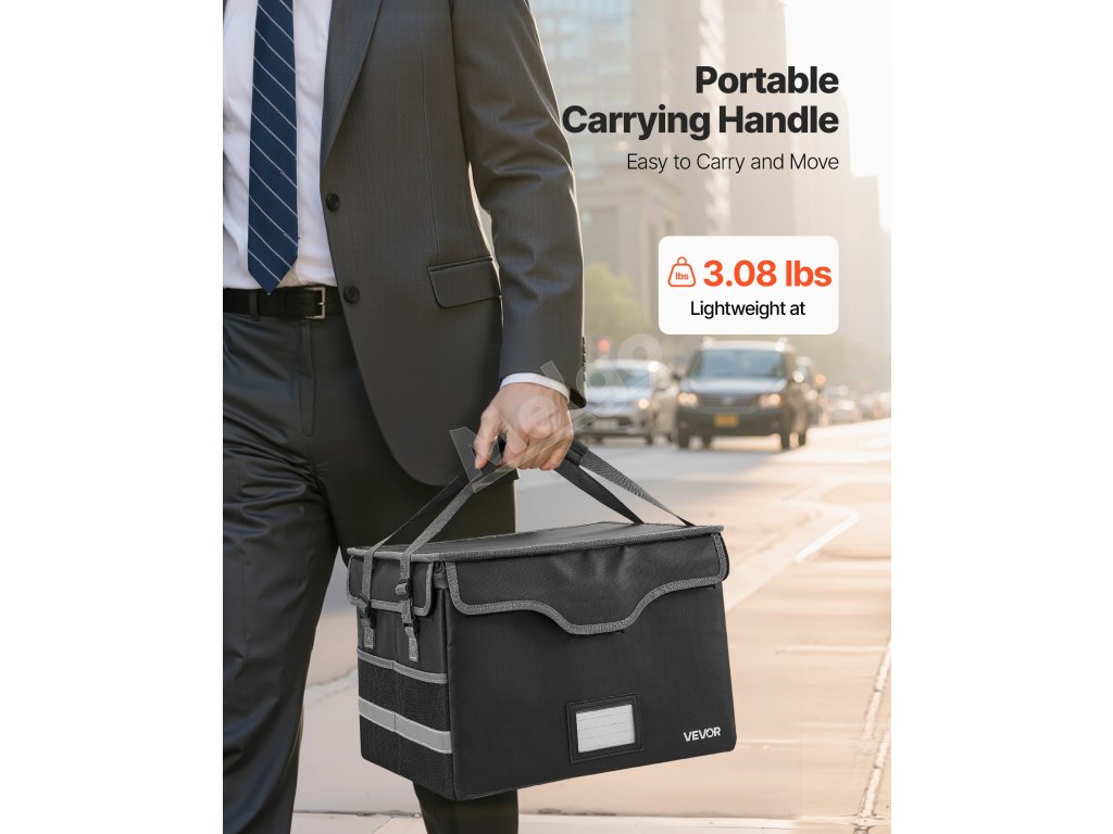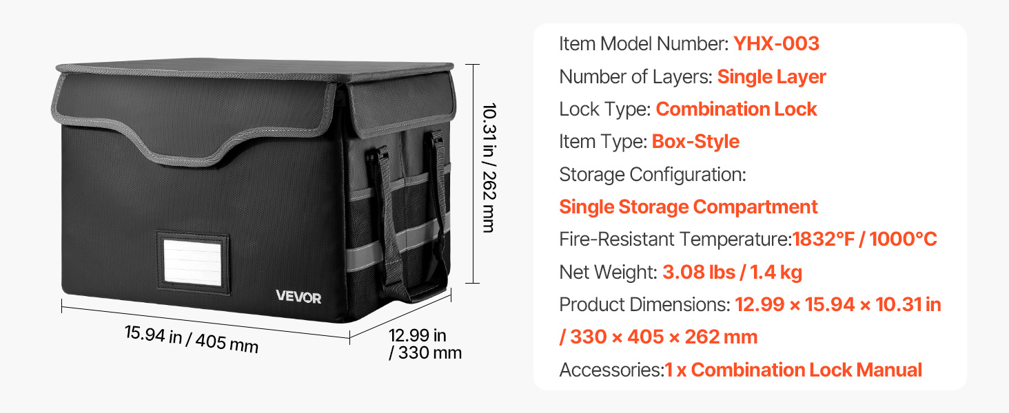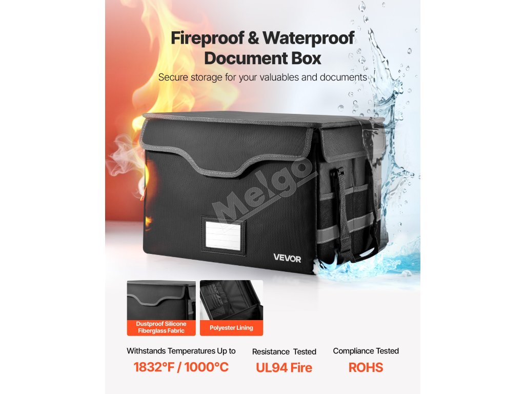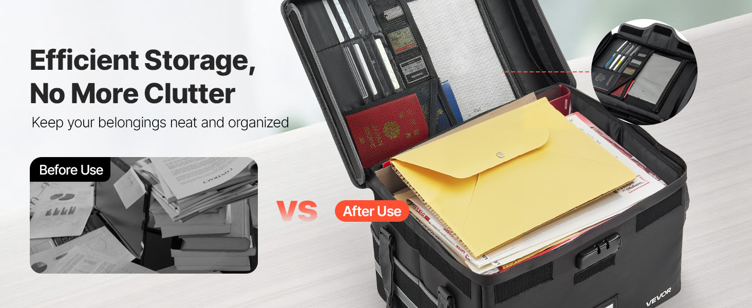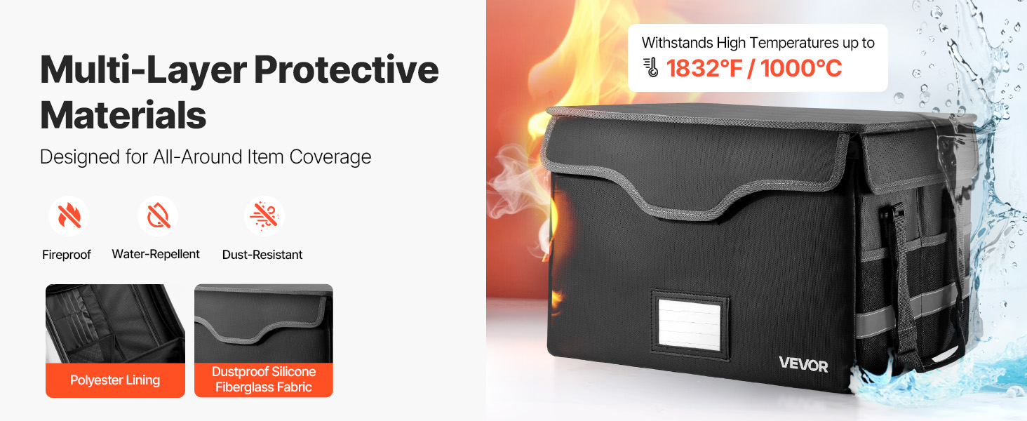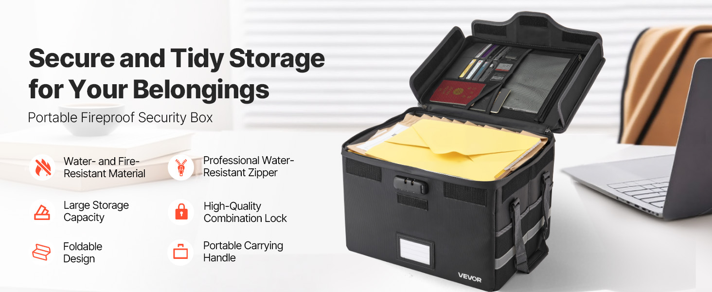 Táto ohňovzdorná schránka odolá 1832℉/1000℃ a chráni pred vodou a prachom. S hmotnosťou 3,08 lbs/1,4 kg organizuje súbory a zariadenia pomocou vrstveného úložného priestoru. Vylepšený kombinovaný zámok a vodotesný zips zvyšujú bezpečnosť cenností doma, v kancelárii alebo na cestách.