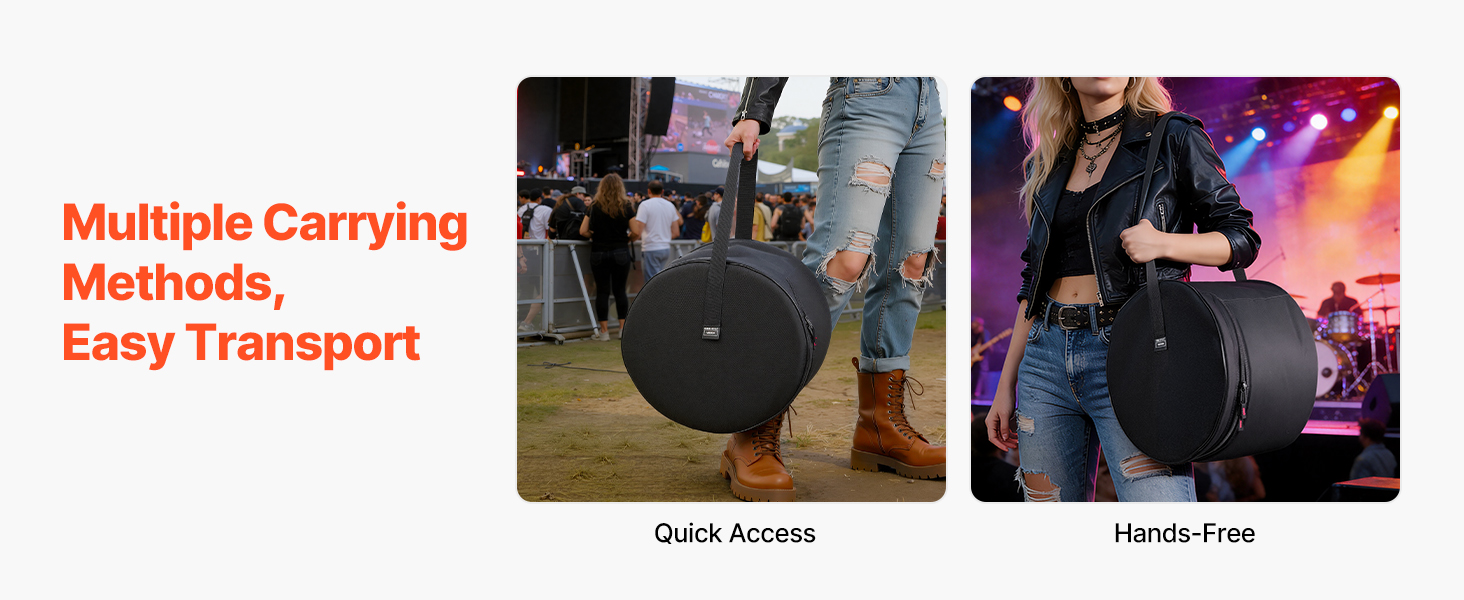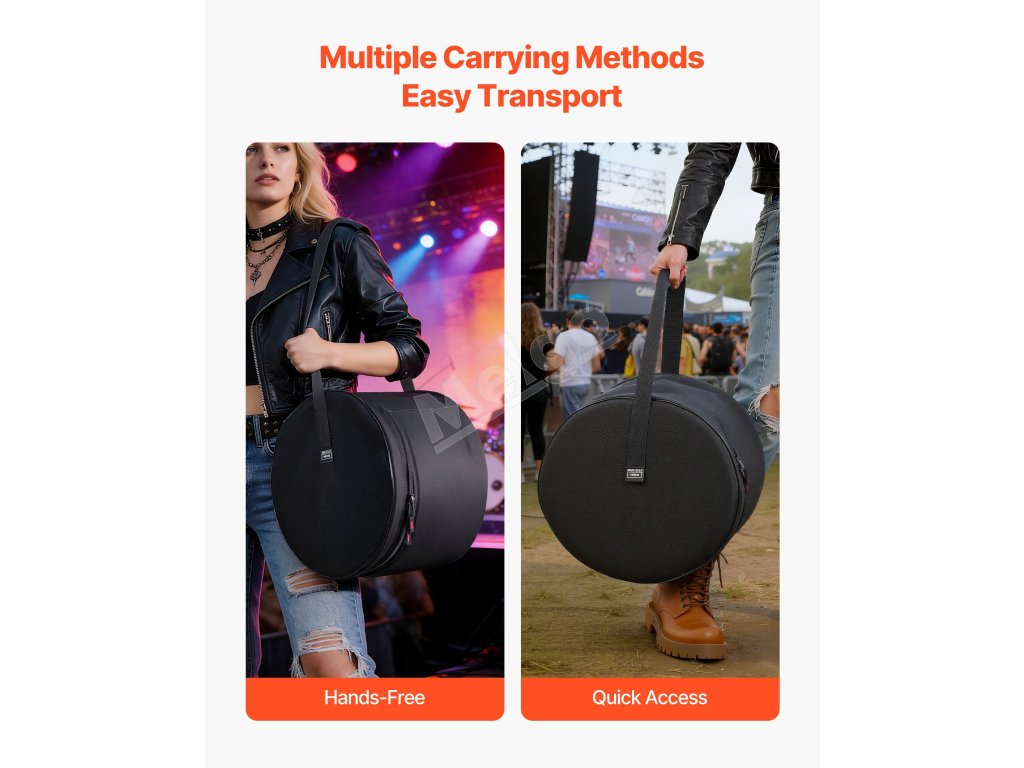 Naše puzdro na elektrické bubny ponúka viacero možností prenášania. Môžete ho zdvihnúť a niesť v ruke alebo prehodiť cez rameno, aby ste mali voľné ruky a mohli ho pohodlne prenášať.