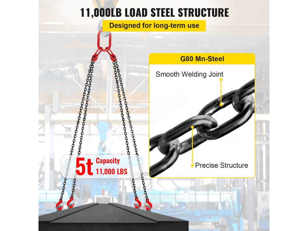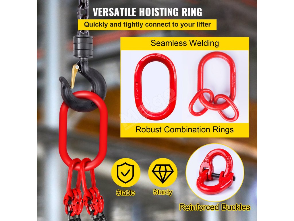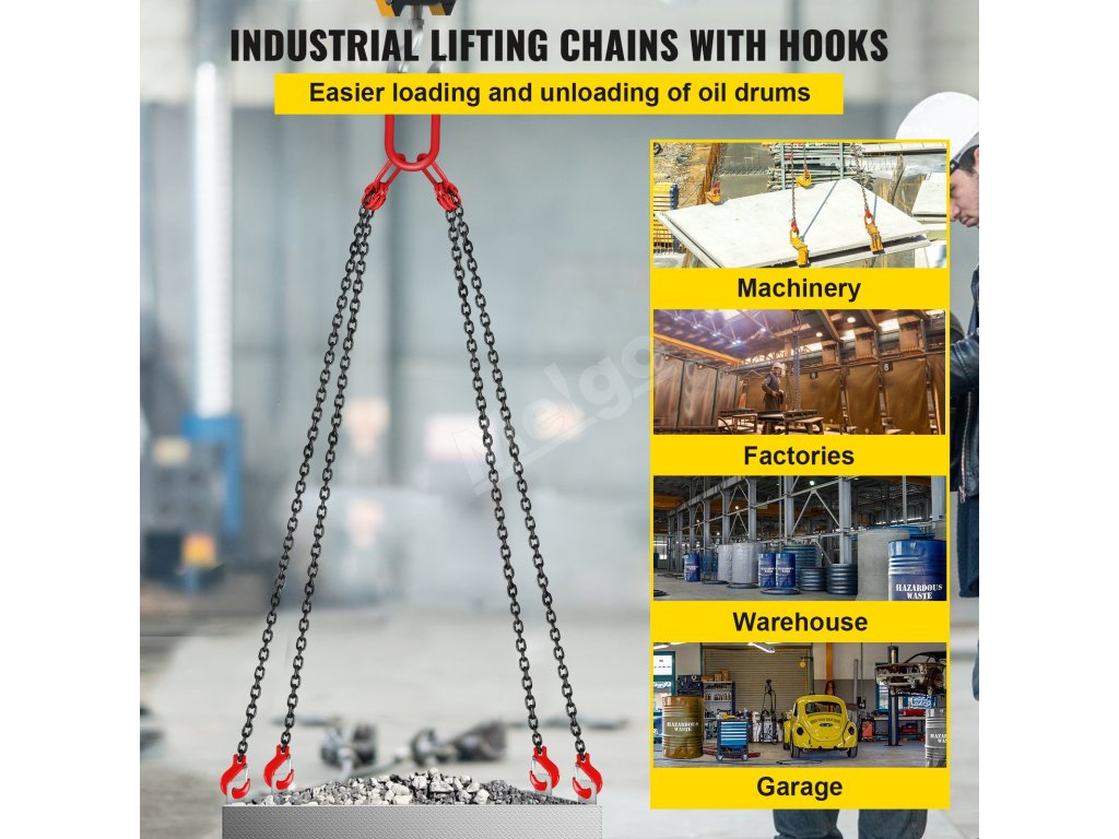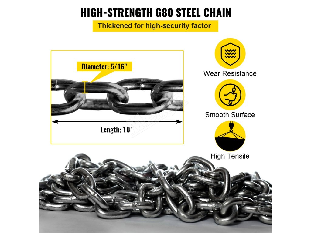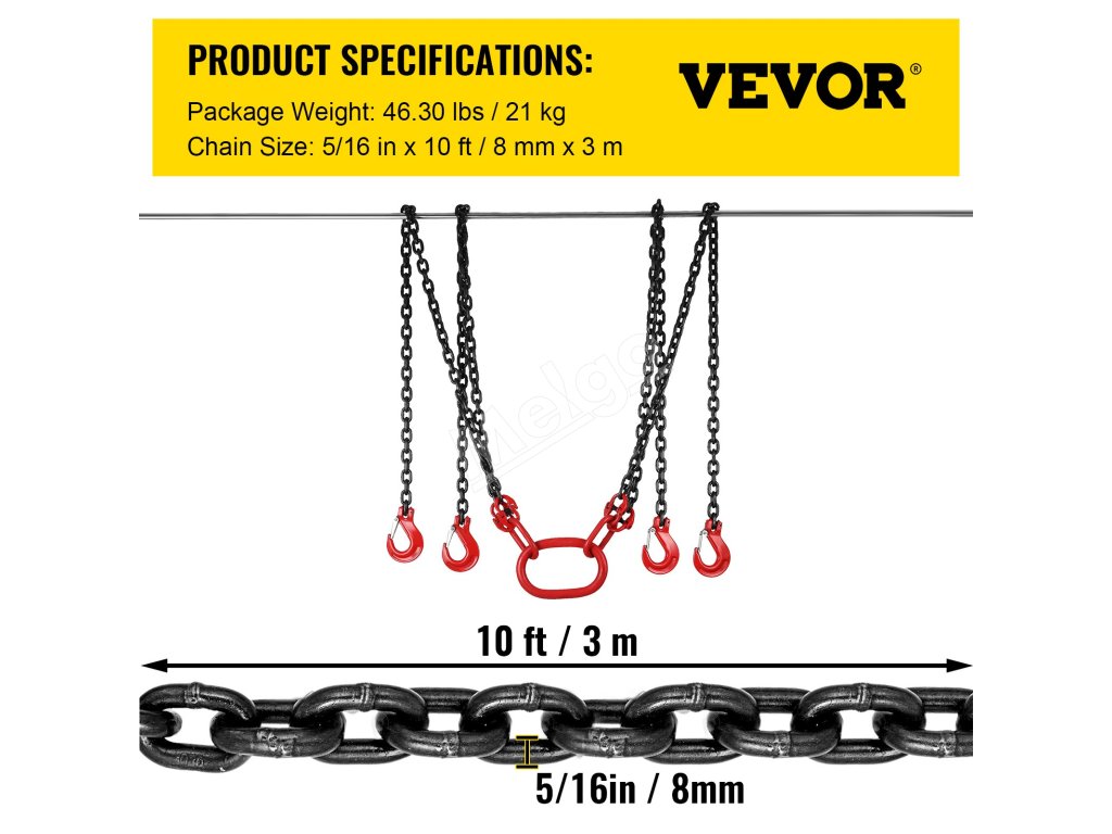 VEVOR, váš exkluzívny expert na náradie. Tento reťazový záves je vyrobený z vysokokvalitnej ocele. Má tiež háky s pružinovými jazýčkami na lepšie uchopenie a zaistenie veľkého nákladu.