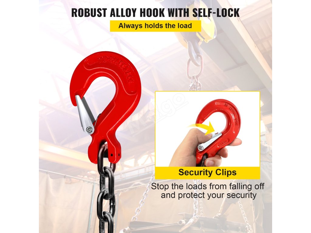 Hák nášho reťazového zdviháka je vybavený bezpečnostnou západkou, ktorá zabezpečí, že váš náklad zostane bezpečný a počas zdvíhania nespadne.