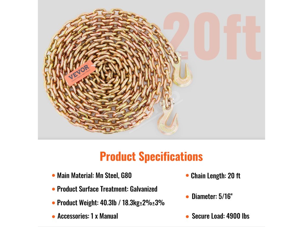 Táto prepravná viazacia reťaz je skonštruovaná tak, aby zvládla náročné úlohy. Je vyrobená z mangánovej ocele. S limitom pracovného zaťaženia 4900 libier zvládne ťažké bremená. Dĺžka 20 stôp a priemer 5/16 palca ponúkajú veľkú všestrannosť. Môžete ho použiť na ťahanie klád, upevňovanie zariadení alebo ťahanie vozidiel. Pozinkovaná reťaz zvyšuje odolnosť a zabraňuje korózii. Vďaka tomu je vhodná na vonkajšie použitie a do drsných podmienok. Či už ju potrebujete na farme, na stavenisku alebo na osobné použitie, táto reťaz svoju prácu zvládne. Dôverujte jej pevnosti a spoľahlivosti aj pri rôznych použitiach.