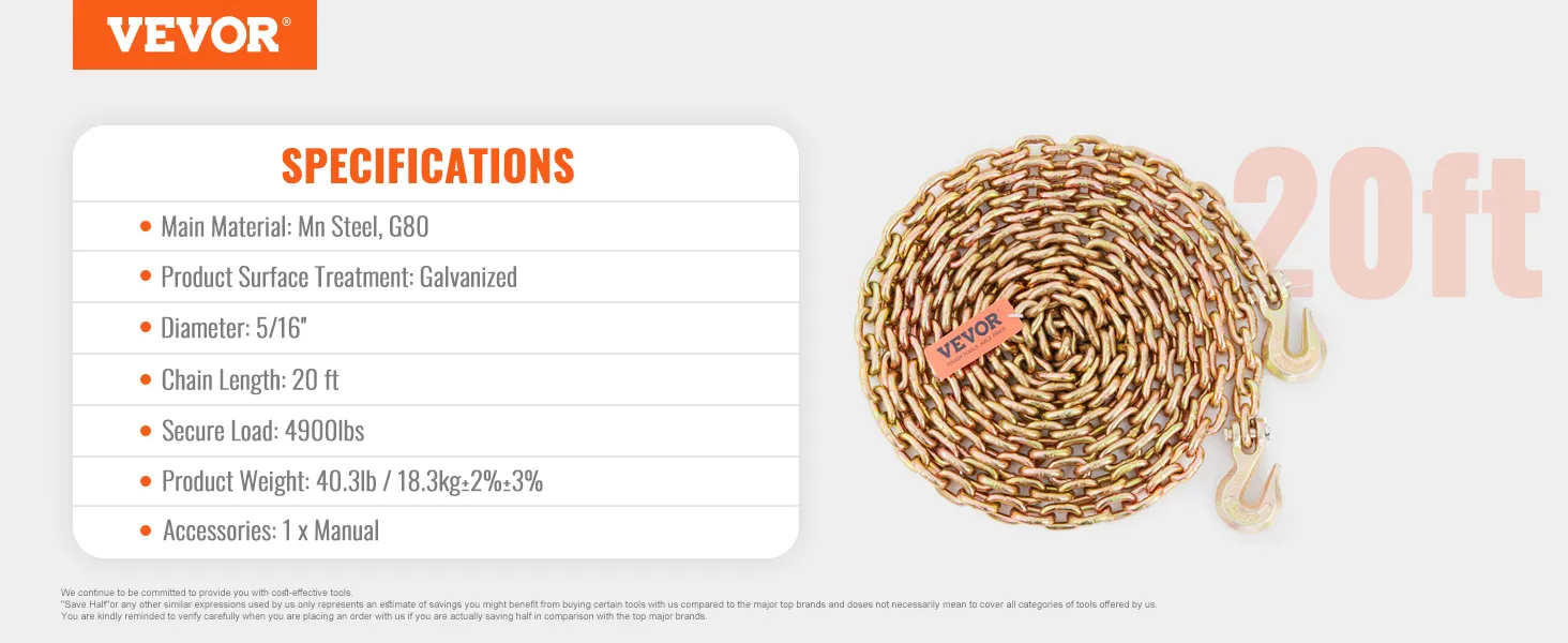 Cena prepravnej reťaze VEVOR ponúka skvelú hodnotu za svoju cenu. Je to cenovo výhodné riešenie pre vaše potreby v oblasti ťahania a zaistenia. Hoci má nižšiu cenu, nerobí kompromisy v kvalite. Reťaz je pevná, odolná a spoľahlivá. Získate spoľahlivý výrobok bez toho, aby ste prerazili banku. Naša prepravná viazacia reťaz vyniká aj tým, že sa dá použiť na mnohé aplikácie. Či už ste poľnohospodár, dodávateľ alebo majiteľ domu, táto reťaz poskytuje vynikajúcu hodnotu. Cenová dostupnosť a spoľahlivosť z nej robia špičkovú voľbu pre každého.