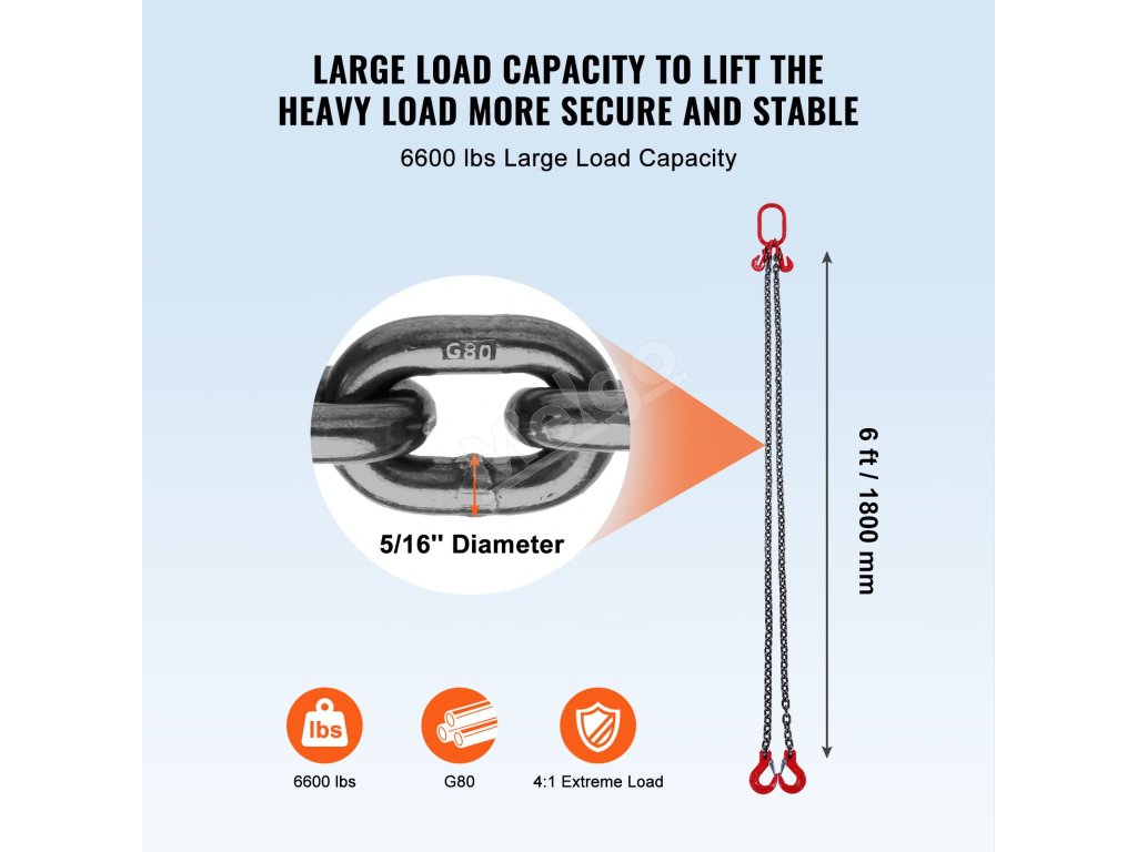 VEVOR, váš exkluzívny expert na náradie. Tento reťazový záves je vyrobený z vysokokvalitnej ocele. Má tiež háky s pružinovými jazýčkami na lepšie uchopenie a zaistenie veľkých nákladov.