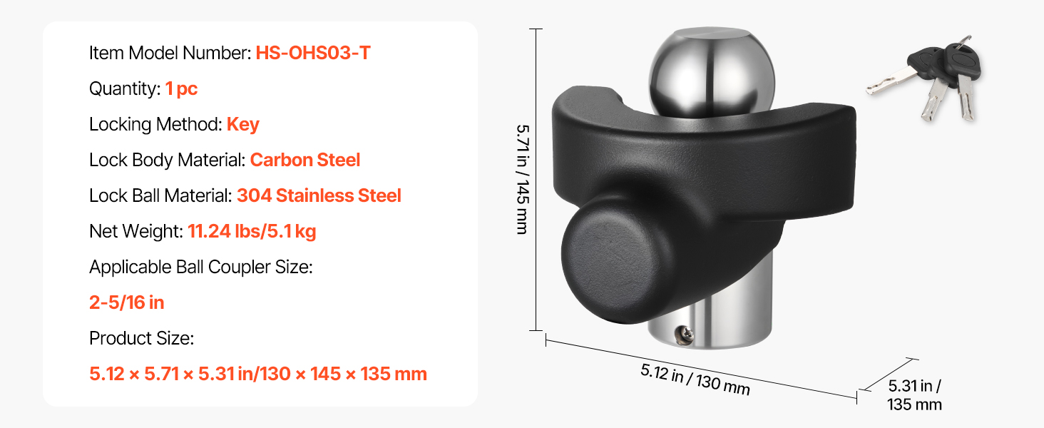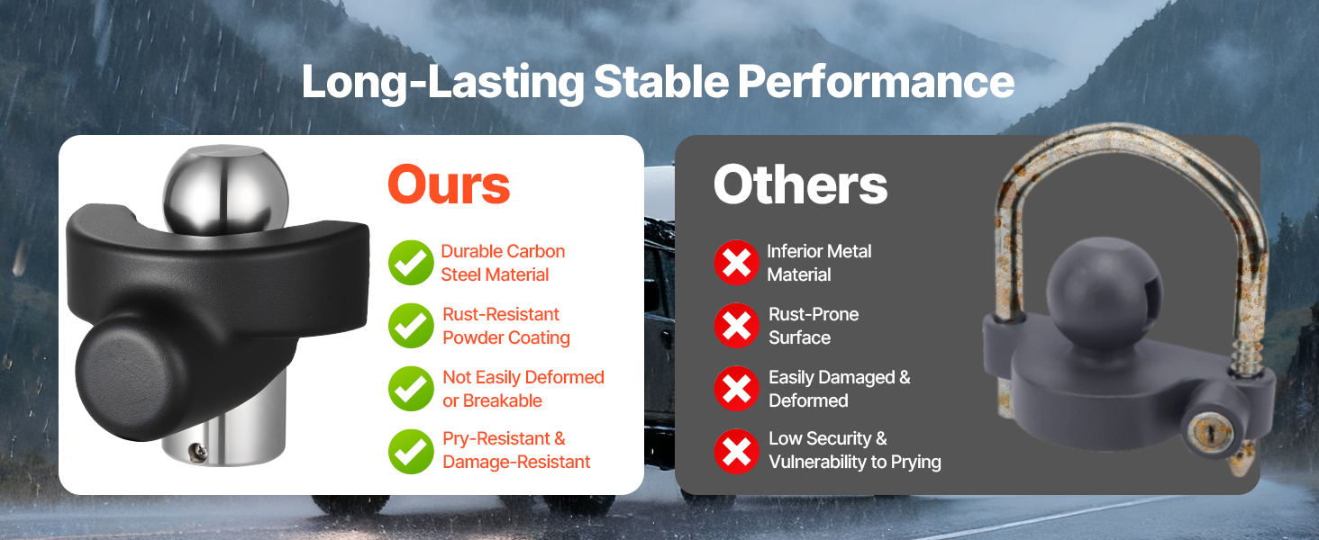 Tento univerzálny zámok guľového závesu je vhodný pre viacero bežných spojovacích zariadení. Je vyrobený z odolnej zliatiny s antikoróznou povrchovou úpravou a zaručuje dlhodobú pevnosť a odolnosť voči náročným podmienkam. Jeho jedinečná konštrukcia proti krádeži zabraňuje vypáčeniu a nárazom, zatiaľ čo jednoduché ovládanie uľahčuje zamykanie a odomykanie.
