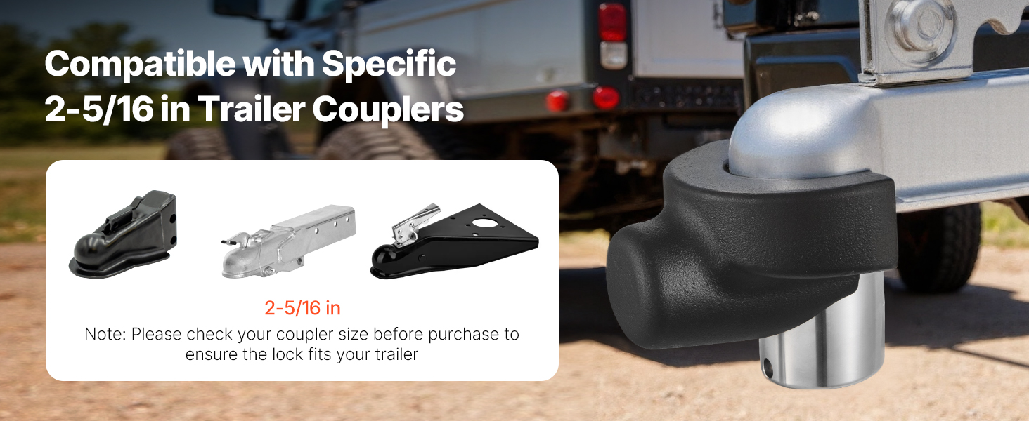 Náš zámok závesu prívesu je kompatibilný so spojovacími zariadeniami prívesu s priemerom 2-5/16 palca, čo poskytuje širokú prispôsobivosť. Pred nákupom si skontrolujte veľkosť svojho spojovacieho zariadenia, aby ste sa uistili, že zámok je vhodný pre váš príves.