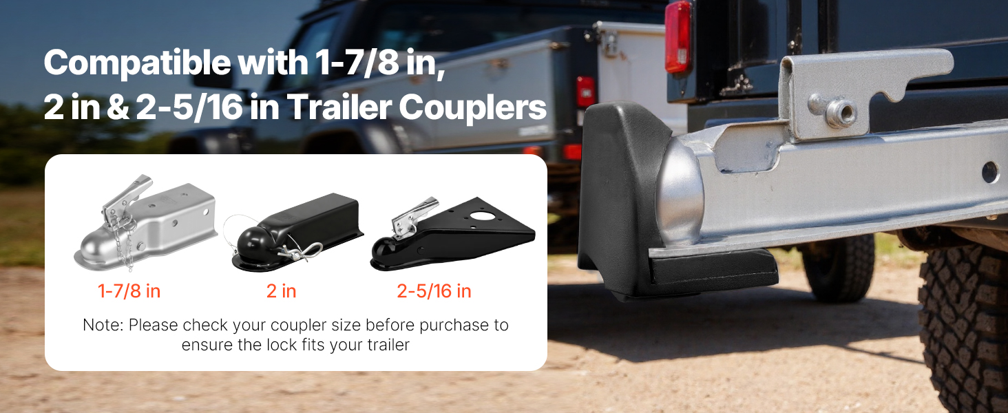 Náš zámok závesu prívesu je kompatibilný so spojovacími zariadeniami prívesu s priemerom 1-7/8 palca, 2 palce a 2-5/16 palca, čím poskytuje širokú prispôsobivosť. Pred nákupom si skontrolujte veľkosť svojho spojovacieho zariadenia, aby ste sa uistili, že zámok je vhodný pre váš príves.
