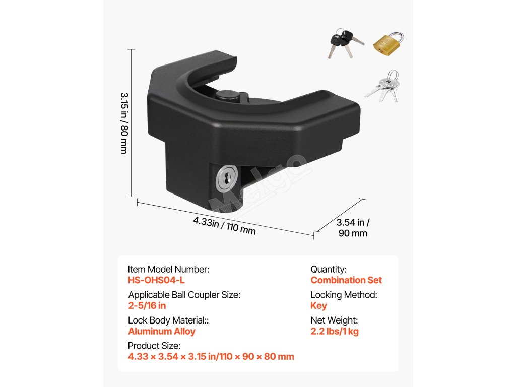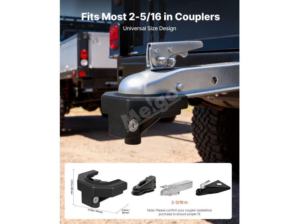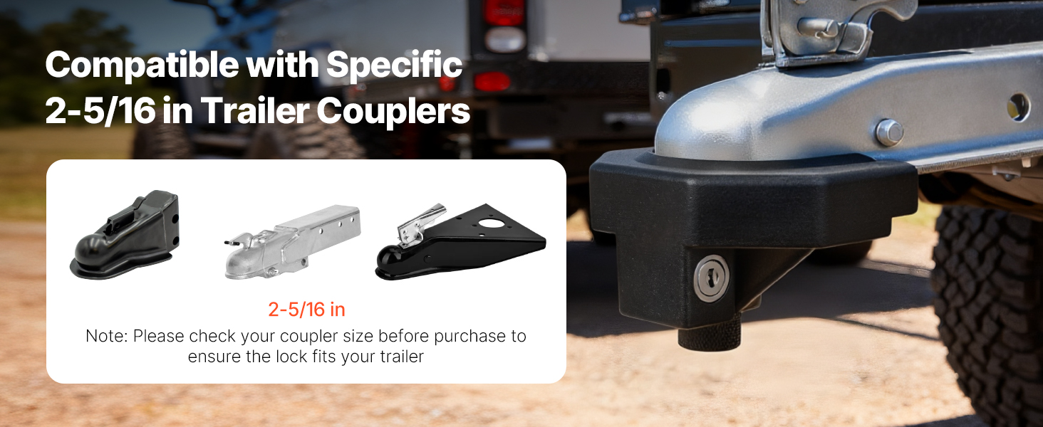 Náš zámok závesu prívesu je kompatibilný so spojovacími zariadeniami prívesu s priemerom 2-5/16 palca, čo poskytuje širokú prispôsobivosť. Pred nákupom si skontrolujte veľkosť svojho spojovacieho zariadenia, aby ste sa uistili, že zámok je vhodný pre váš príves.