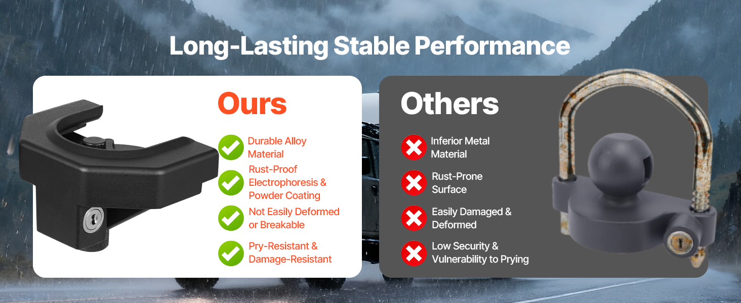 Či už ťaháte príves, kempujete s karavanom alebo prepravujete loď, tento úžitkový zámok na príves poskytuje spoľahlivú ochranu. Je vhodný pre prívesy, obytné automobily, terénne vozidlá a lode, čím vám poskytne pokoj v každom scenári.