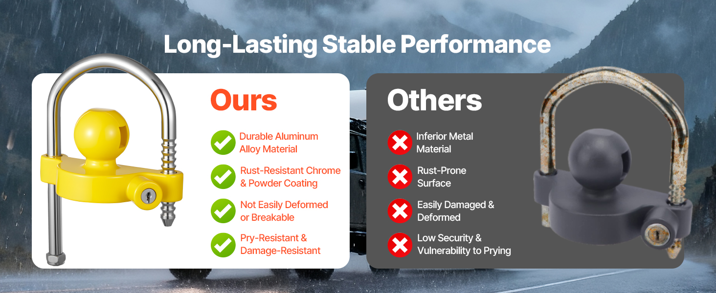 Tento guľový zámok prívesu, ktorý je vybavený odolnou hliníkovou zliatinou, poskytuje pevnú konštrukciu, ktorá odolá deformácii alebo rozbitiu. Jeho pochrómovaný a práškovo lakovaný povrch je odolný voči korózii a korózii a prispôsobí sa rôznym náročným podmienkam. Vysokopevnostná konštrukcia zabraňuje páčeniu a nárazom.