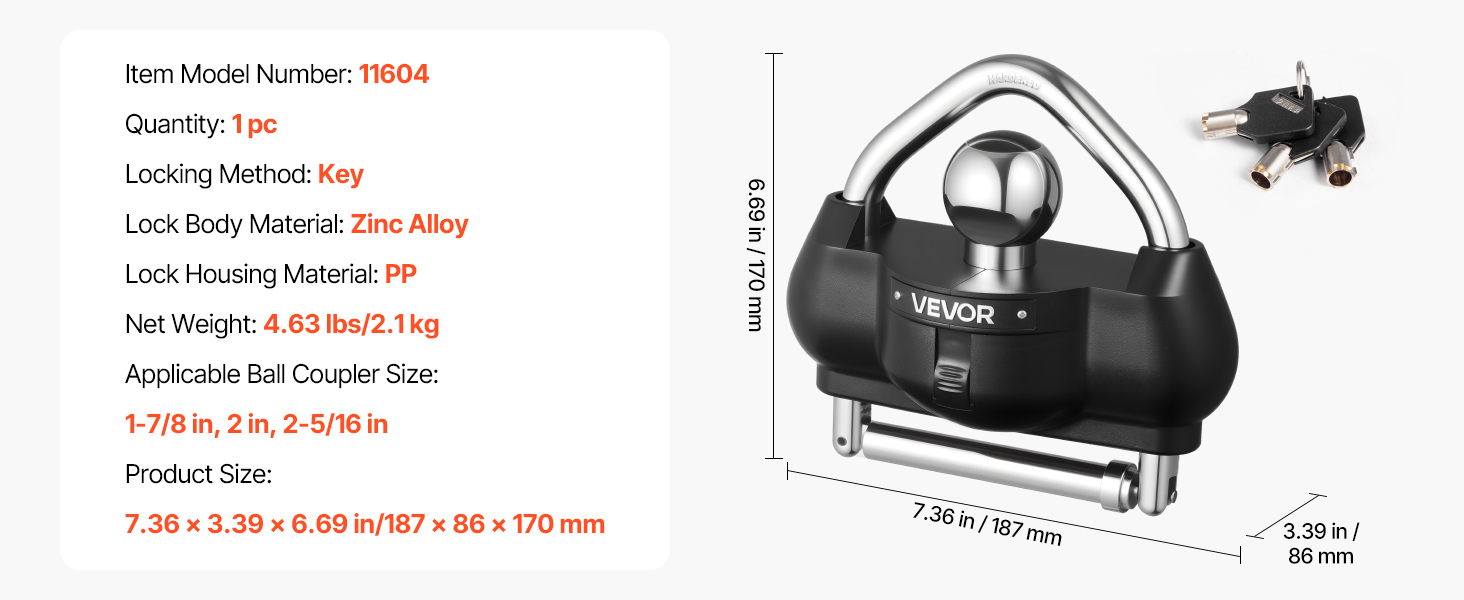 Tento univerzálny zámok guľového závesu je vhodný pre viacero bežných spojovacích zariadení. Je vyrobený z odolnej zliatiny s antikoróznou povrchovou úpravou a zaručuje dlhodobú pevnosť a odolnosť voči náročným podmienkam. Jeho jedinečná konštrukcia proti krádeži zabraňuje vypáčeniu a nárazom, zatiaľ čo jednoduché ovládanie uľahčuje zamykanie a odomykanie.