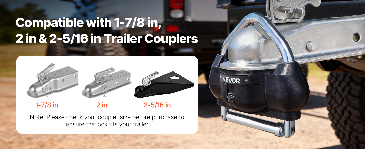Náš zámok závesu prívesu je kompatibilný so spojovacími zariadeniami prívesu s priemerom 1-7/8 palca, 2 palce a 2-5/16 palca, čím poskytuje širokú prispôsobivosť. Pred nákupom si skontrolujte veľkosť svojho spojovacieho zariadenia, aby ste sa uistili, že zámok je vhodný pre váš príves.