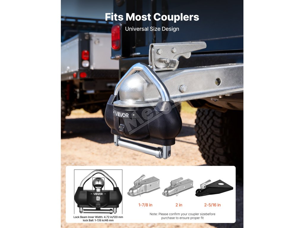 Náš zámok závesu prívesu je kompatibilný so spojovacími zariadeniami prívesu s priemerom 1-7/8 palca, 2 palce a 2-5/16 palca, čím poskytuje širokú prispôsobivosť. Pred nákupom si skontrolujte veľkosť svojho spojovacieho zariadenia, aby ste sa uistili, že zámok je vhodný pre váš príves.