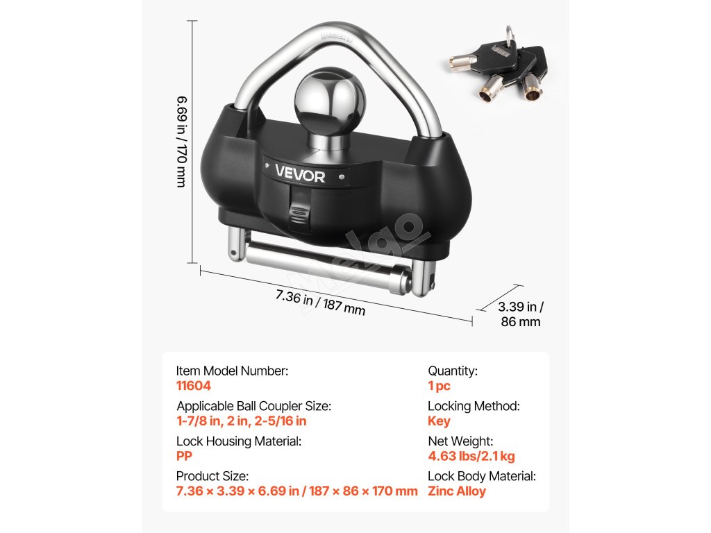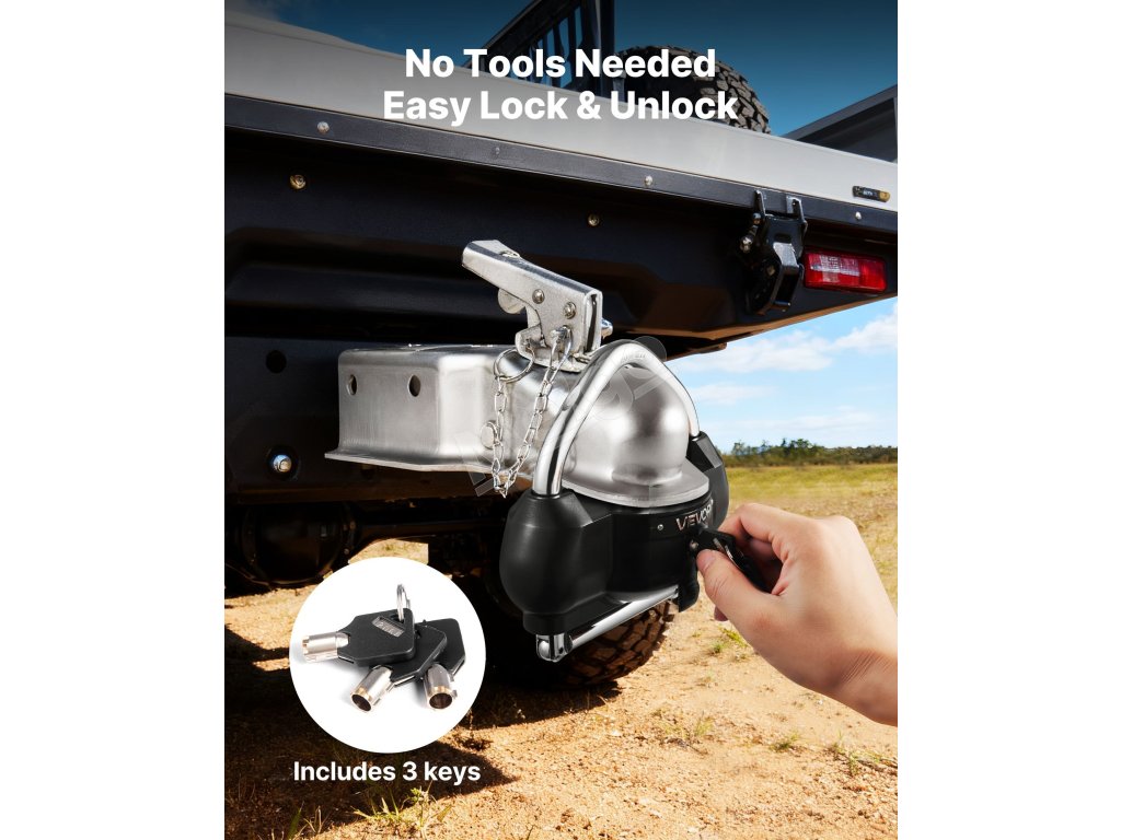 Tento univerzálny zámok guľového závesu je vhodný pre viacero bežných spojovacích zariadení. Je vyrobený z odolnej zliatiny s antikoróznou povrchovou úpravou a zaručuje dlhodobú pevnosť a odolnosť voči náročným podmienkam. Jeho jedinečná konštrukcia proti krádeži zabraňuje vypáčeniu a nárazom, zatiaľ čo jednoduché ovládanie uľahčuje zamykanie a odomykanie.