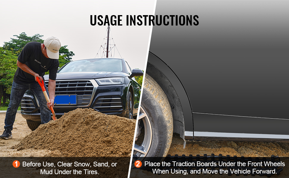 Postup, ako používať trakčnú podložku pod pneumatiky, je nasledovný: 1. Odstráňte sneh, piesok alebo blato spod pneumatiky pomocou lopaty. 2. Odstráňte všetok materiál pred všetkými pneumatikami. 3. Pod predné kolesá umiestnite vyprosťovaciu dosku a pohnite vozidlom dopredu. 4. Opakujte pre dve alebo všetky štyri kolesá.