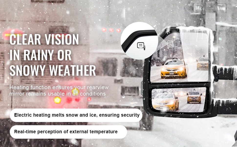 Nedovoľte, aby vám dážď alebo sneh zatienili výhľad! Naše zrkadlá pre nákladné vozidlá sú vybavené vyhrievaním, ktoré ich udržiava čisté a bez zahmlievania, vďaka čomu budete mať vždy jasný výhľad na to, čo je za vami.