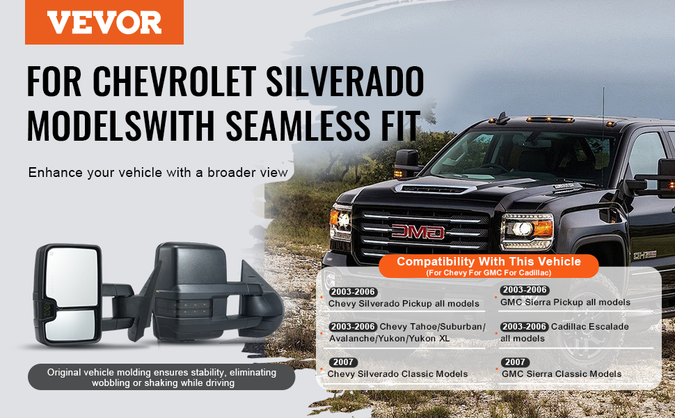 Naše ťažné zrkadlá sú špeciálne vyrobené pre modely Chevrolet Silverado (2003-2007), GMC a Cadillac. Originálne tvarovanie vozidla zaručuje kompatibilitu bez akýchkoľvek problémov.