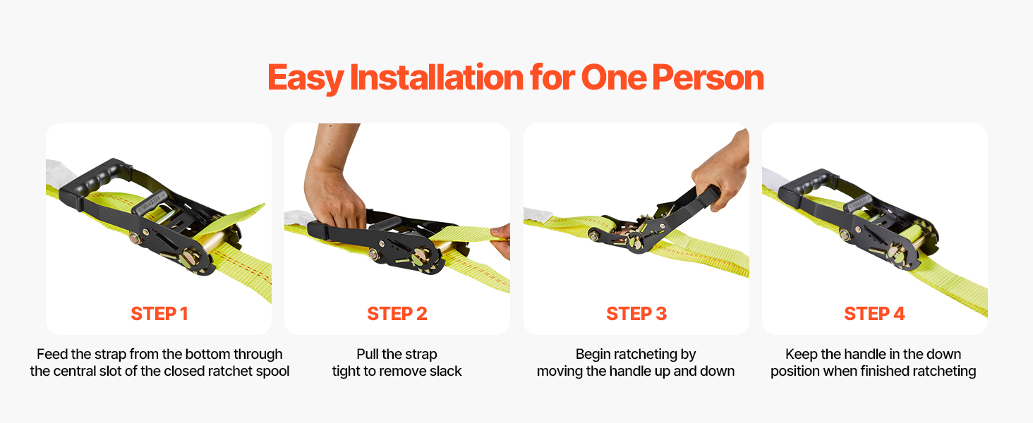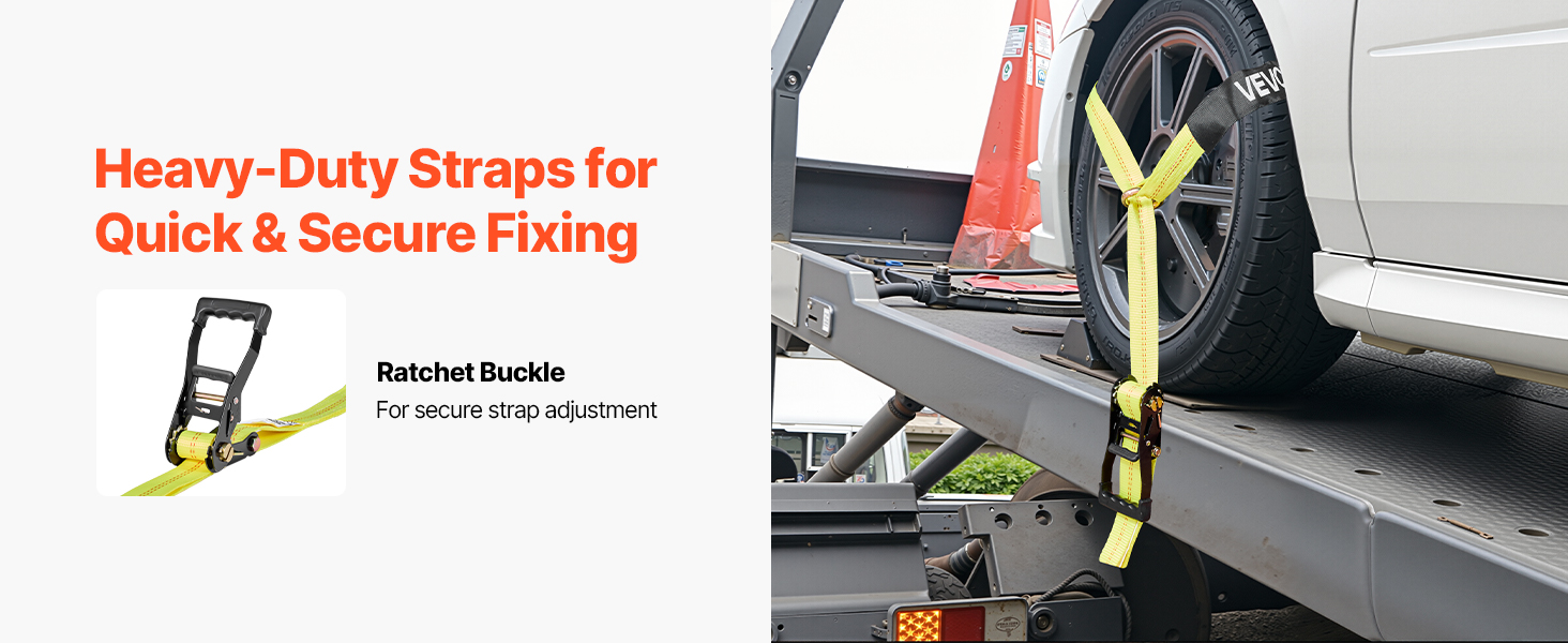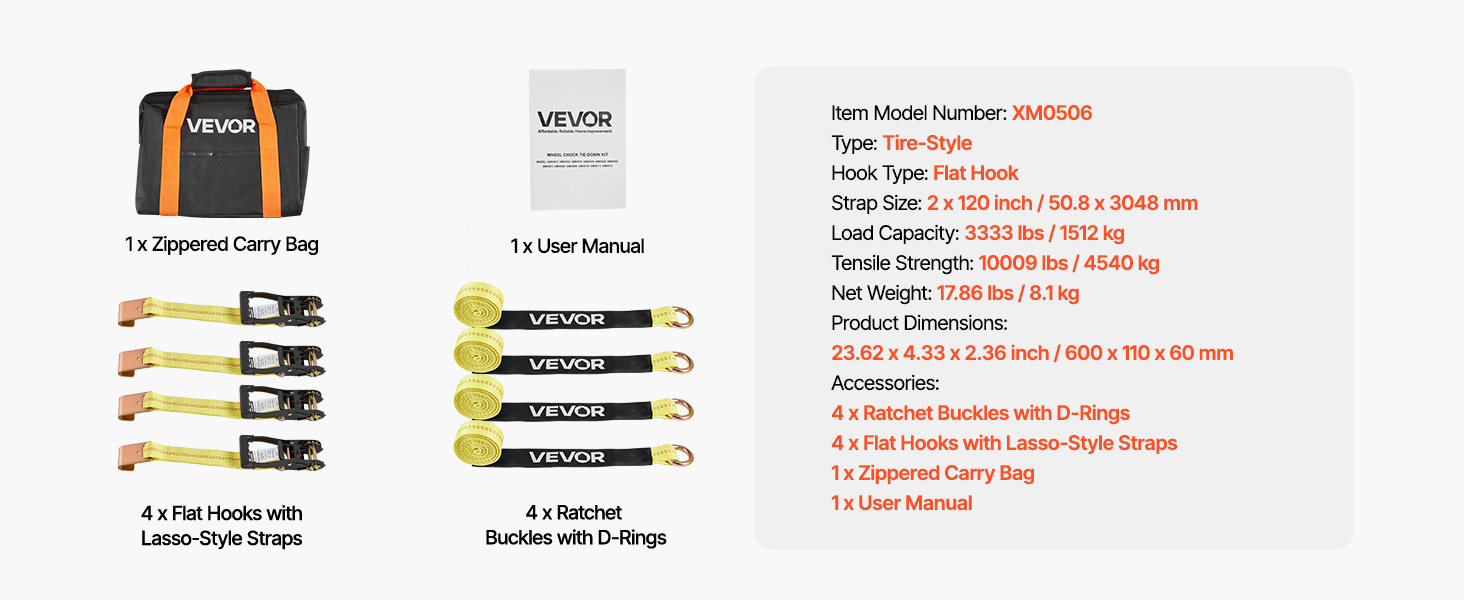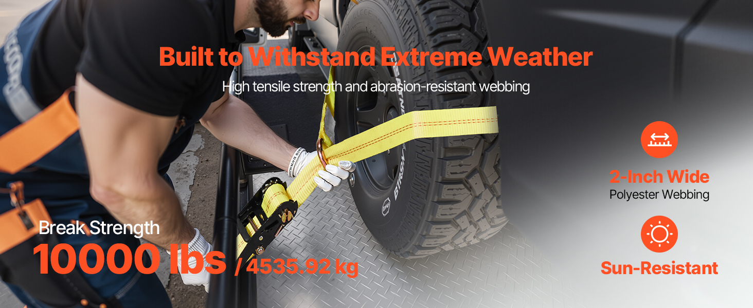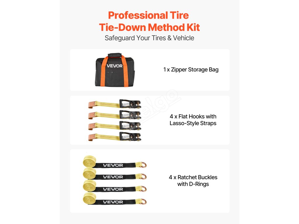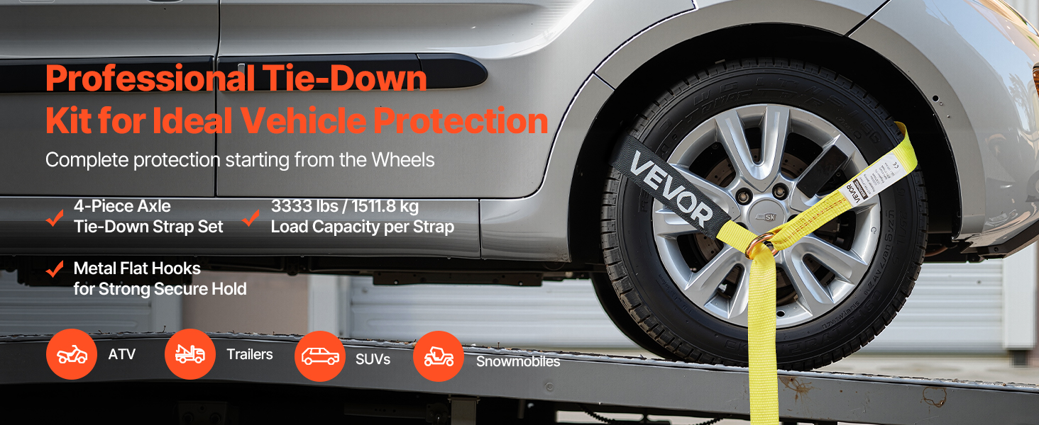 Naša súprava na upevnenie kolies poskytuje rýchlu a jednoduchú konfiguráciu na upevnenie pneumatiky, ktorú možno upevniť priamo okolo pneumatiky. Každý popruh unesie až 3333 lbs/1512 kg a udrží vaše vozidlo na mieste počas prepravy alebo parkovania.