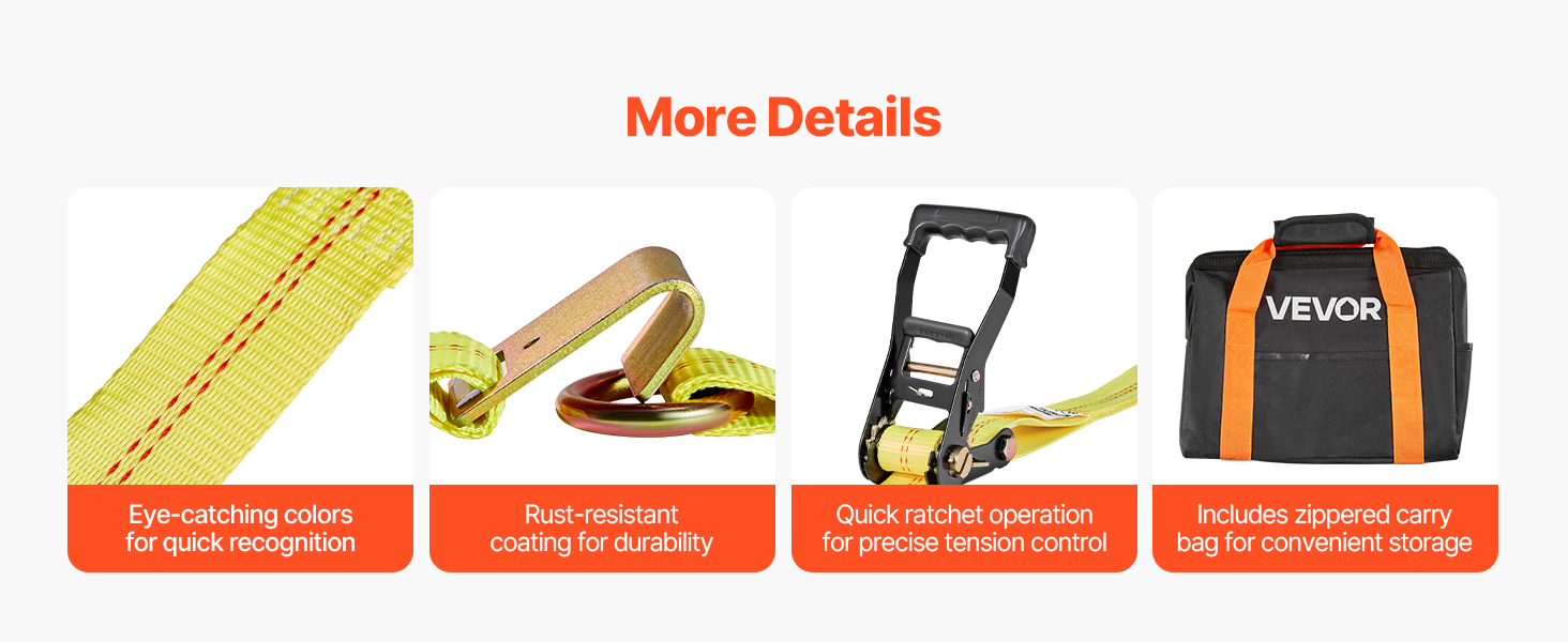 Vďaka pútavému jasnému farebnému dizajnu je tento popruh na uviazanie auta ľahko viditeľný a ovládateľný. Povrch odolný proti korózii zaručuje trvanlivosť, zatiaľ čo úložné vrecko na zips je prenosné a ľahko sa skladuje na spoľahlivé používanie.