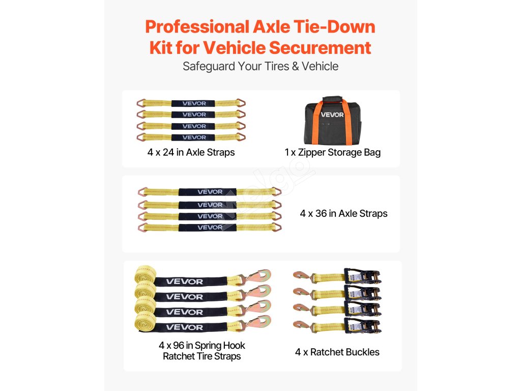 Vďaka kombinácii dlhých a krátkych popruhov poskytuje 4-dielna súprava uväzovacích popruhov na kolesá flexibilitu. Dokáže vytvoriť prispôsobený krížový vzor pre vyvážené rozloženie hmotnosti a maximálnu stabilitu.