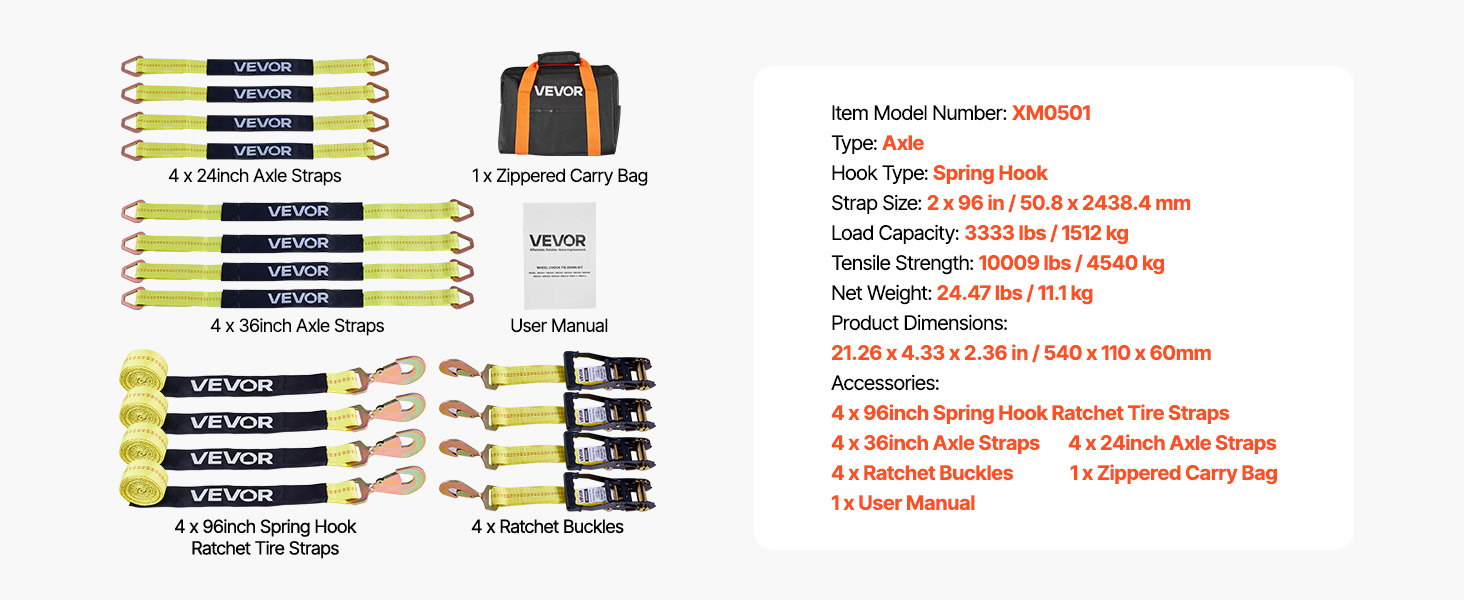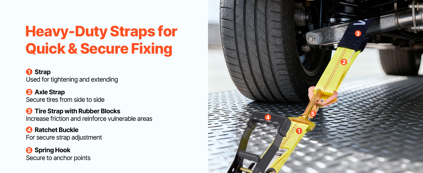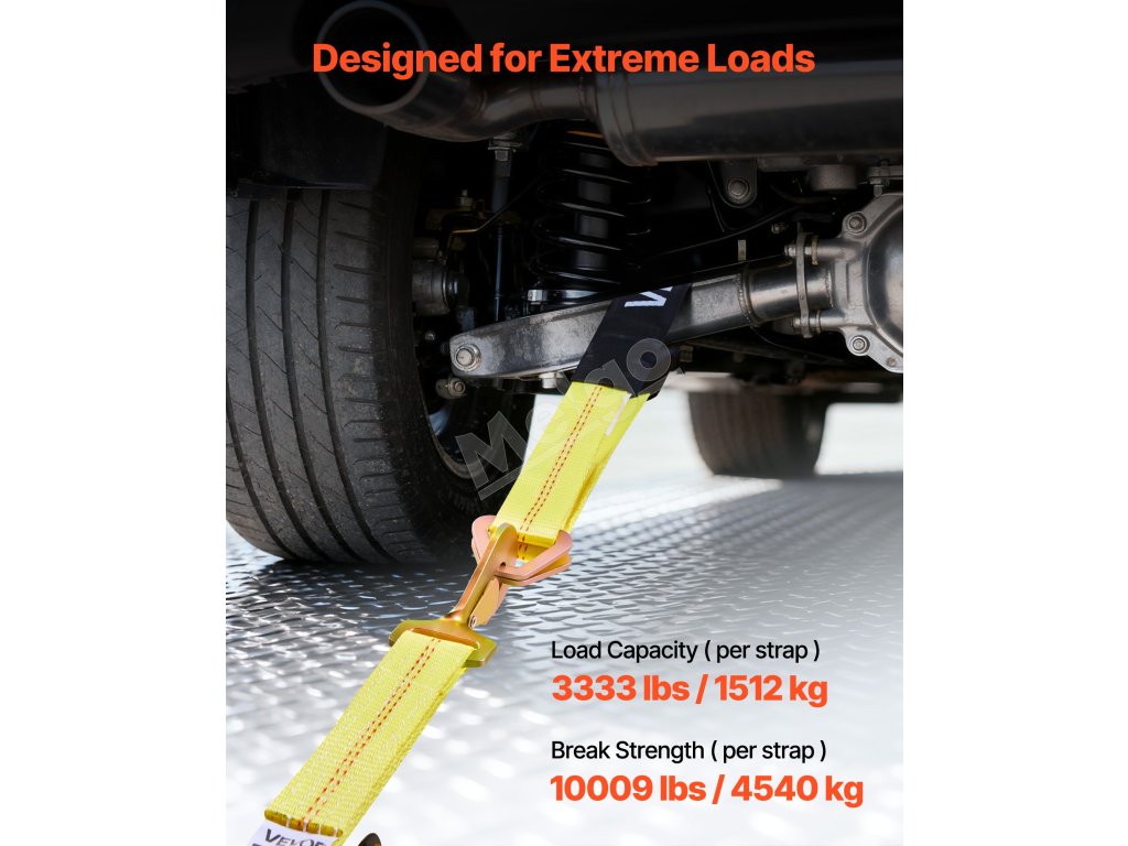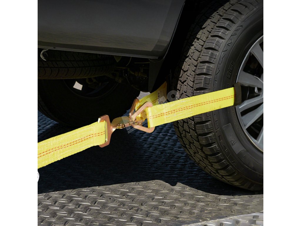 Vďaka našej súprave na viazanie auta, ktorá je vybavená pružinovými hákmi, je zabezpečenie vášho vozidla rýchle a jednoduché. Pripevnite ho k pevnému bodu nápravy, utiahnite račňu a zakaždým dosiahnite stabilné nastavenie s minimálnym úsilím.