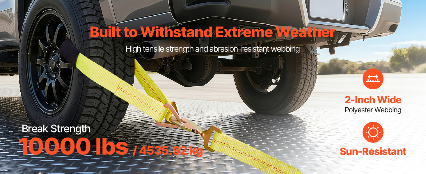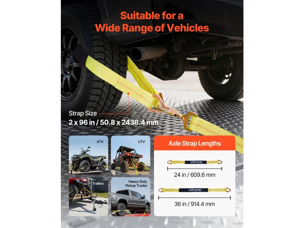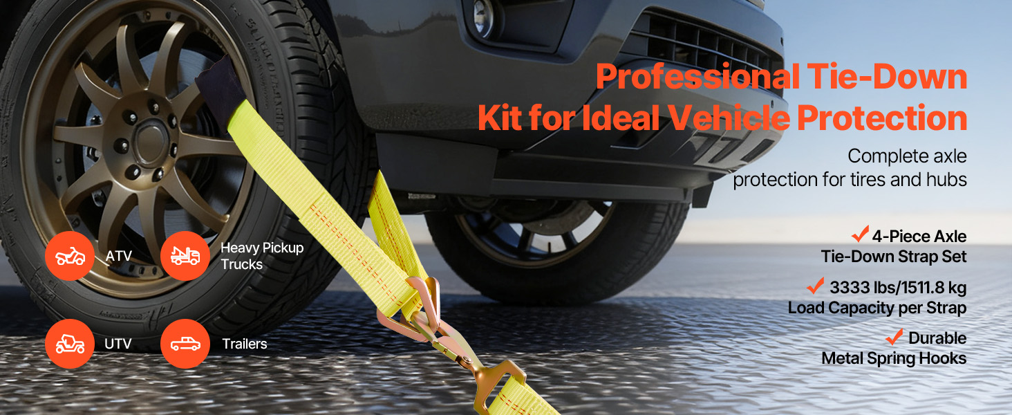 Prekročte rámec základných pásov na pneumatiky. Tieto popruhy na nápravu z našej súpravy na viazanie kolies pomáhajú minimalizovať poškodenie pneumatík a zavesenia počas prepravy. Každý popruh unesie až 3333 lbs/1512 kg, čím udrží ťažké pickupy alebo cenné klasické autá pevne na mieste.