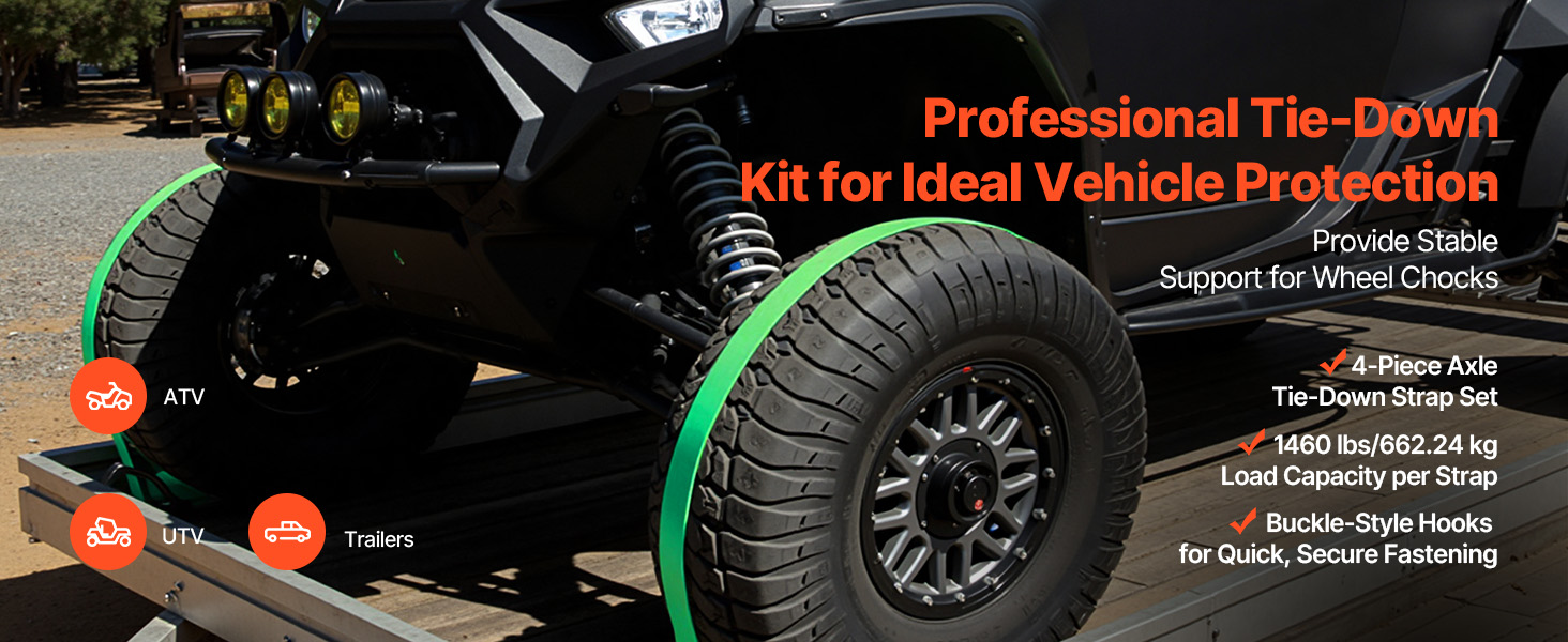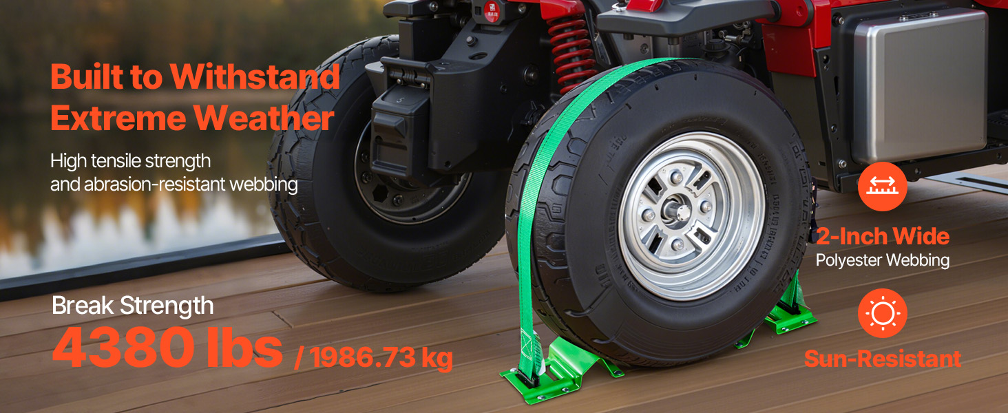Prekročte rámec základných pásov na pneumatiky. Popruhy na nápravu našej súpravy na upevnenie kolies pomáhajú minimalizovať poškodenie pneumatík a zavesenia počas prepravy, čo je ideálne pre vozidlá bez ručnej brzdy alebo na svahoch. Každý popruh unesie až 1460 lbs/662 kg, čím zabezpečí, že vaše vozidlo zostane stabilné počas prepravy alebo parkovania.