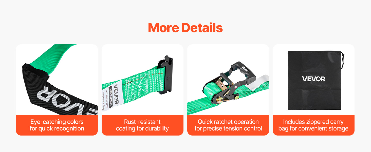 Vďaka pútavému jasnému farebnému dizajnu je tento popruh na uviazanie auta ľahko viditeľný a ovládateľný. Povrch odolný proti korózii zaručuje trvanlivosť, zatiaľ čo úložná taška na zips je prenosná a ľahko sa skladuje na spoľahlivé používanie.