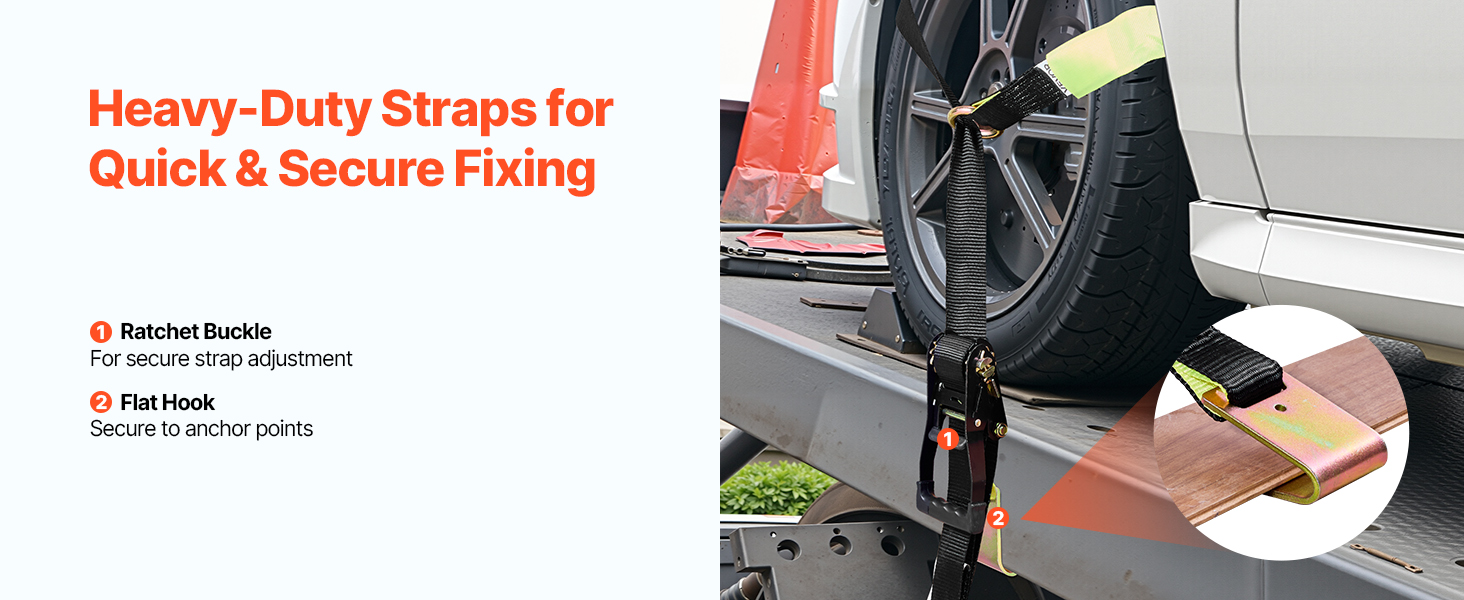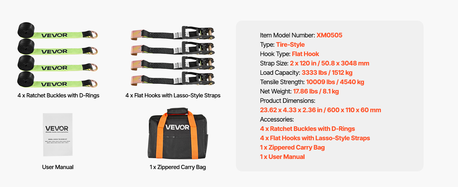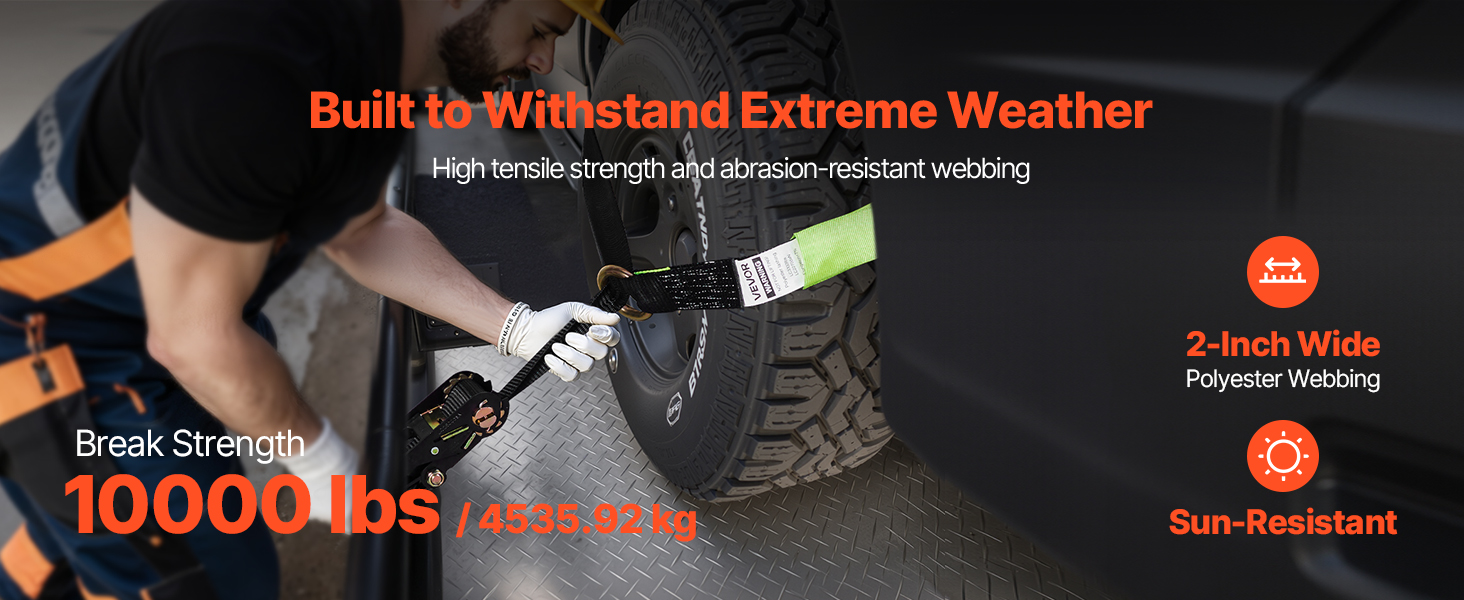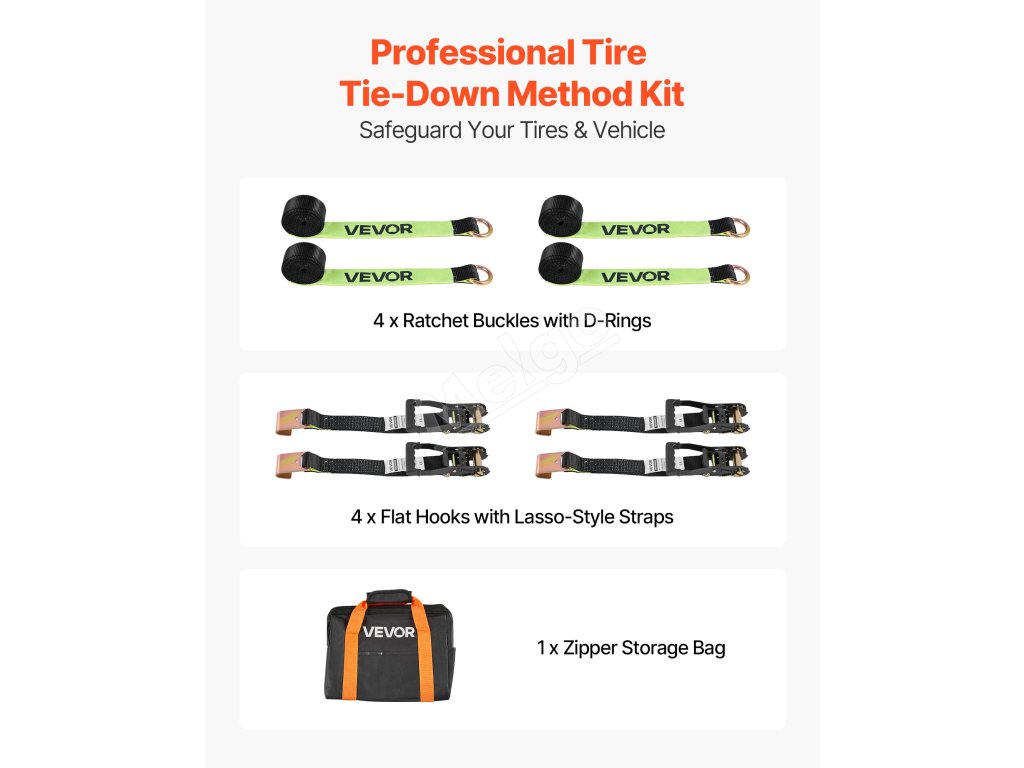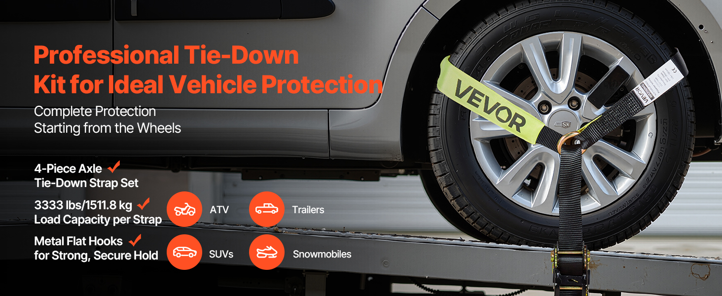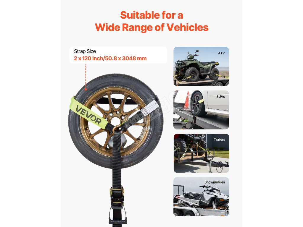 Naša súprava na upevnenie kolies poskytuje rýchlu a jednoduchú konfiguráciu na upevnenie pneumatiky, ktorú možno upevniť priamo okolo pneumatiky. Každý popruh unesie až 3333 lbs/1512 kg a udrží vaše vozidlo na mieste počas prepravy alebo parkovania.