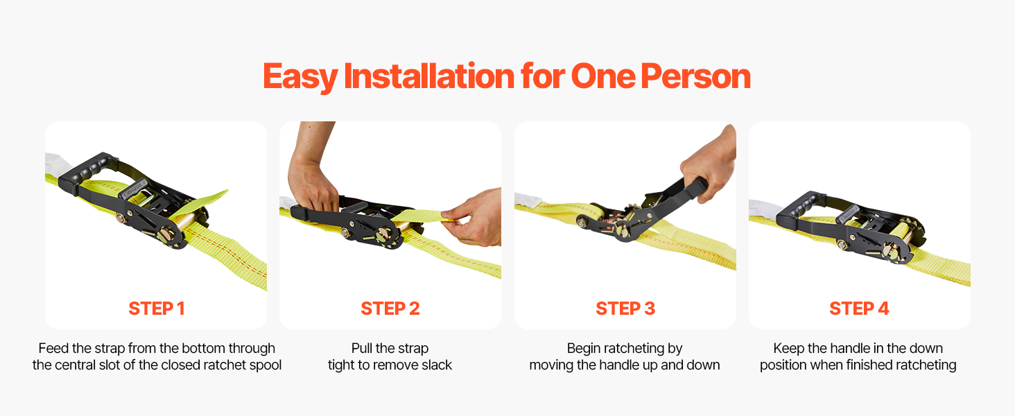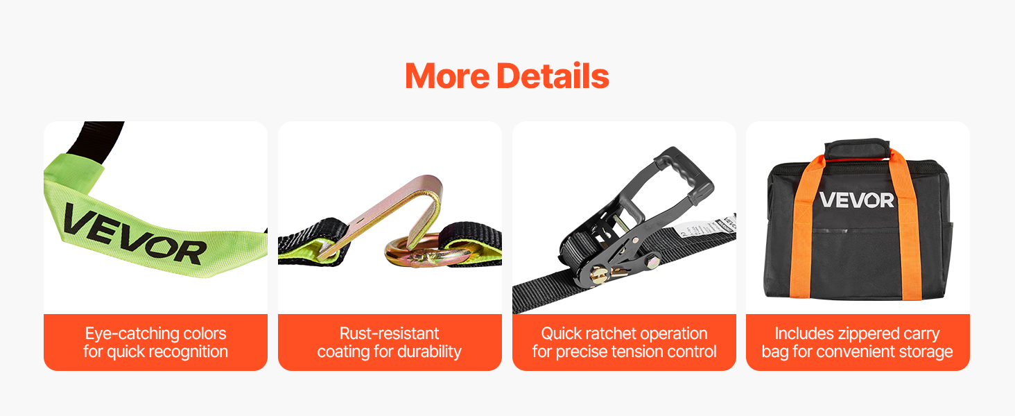 Vďaka pútavému jasnému farebnému dizajnu je tento popruh na uviazanie auta ľahko viditeľný a ovládateľný. Povrch odolný proti korózii zaručuje trvanlivosť, zatiaľ čo úložné vrecko na zips je prenosné a ľahko sa skladuje na spoľahlivé používanie.