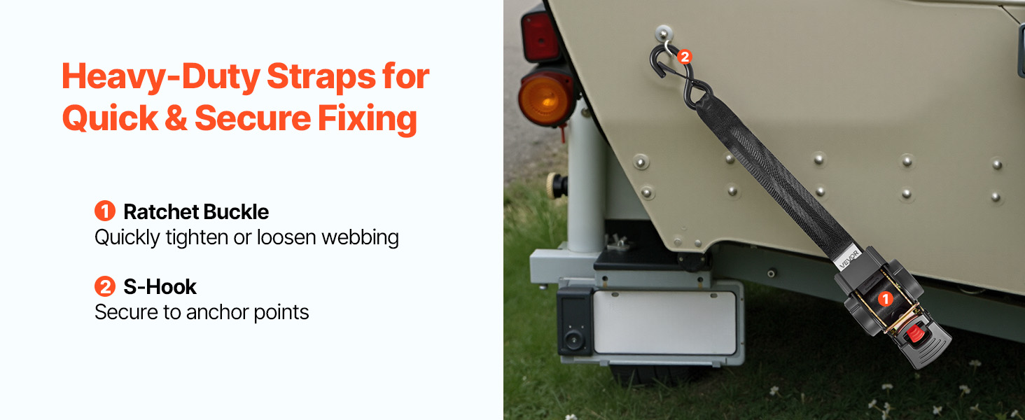 Vďaka našej súprave na viazanie automobilov, ktorá je vybavená S-hákmi, je zabezpečenie vášho vozidla rýchle a jednoduché. Pripevnite ho k pevnému bodu nápravy, pevne zatiahnite za račňu a zakaždým dosiahnite stabilné nastavenie s minimálnym úsilím.