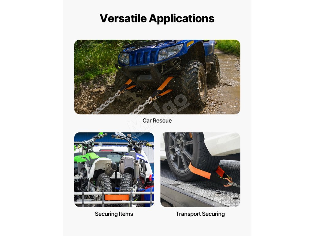 S našimi ťažkými viazacími popruhmi na nápravu ich môžete rýchlo omotať okolo vozidla alebo predmetu a spojiť ich pomocou háčikov kompatibilných s rôznymi tvarmi hákov. Rýchla inštalácia zvyšuje efektivitu.