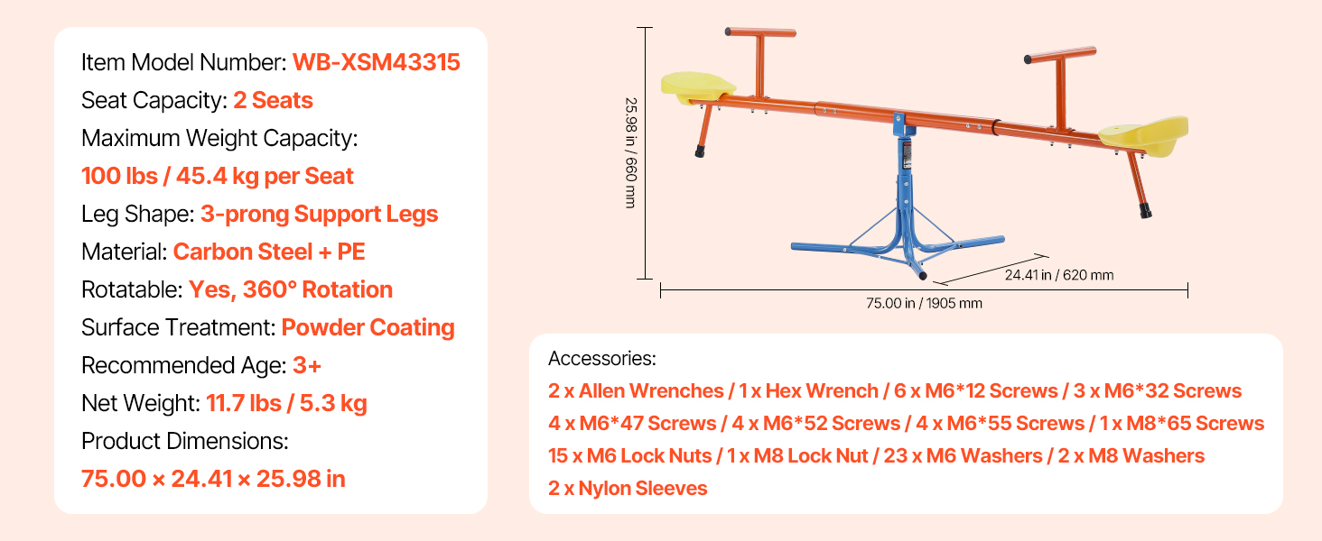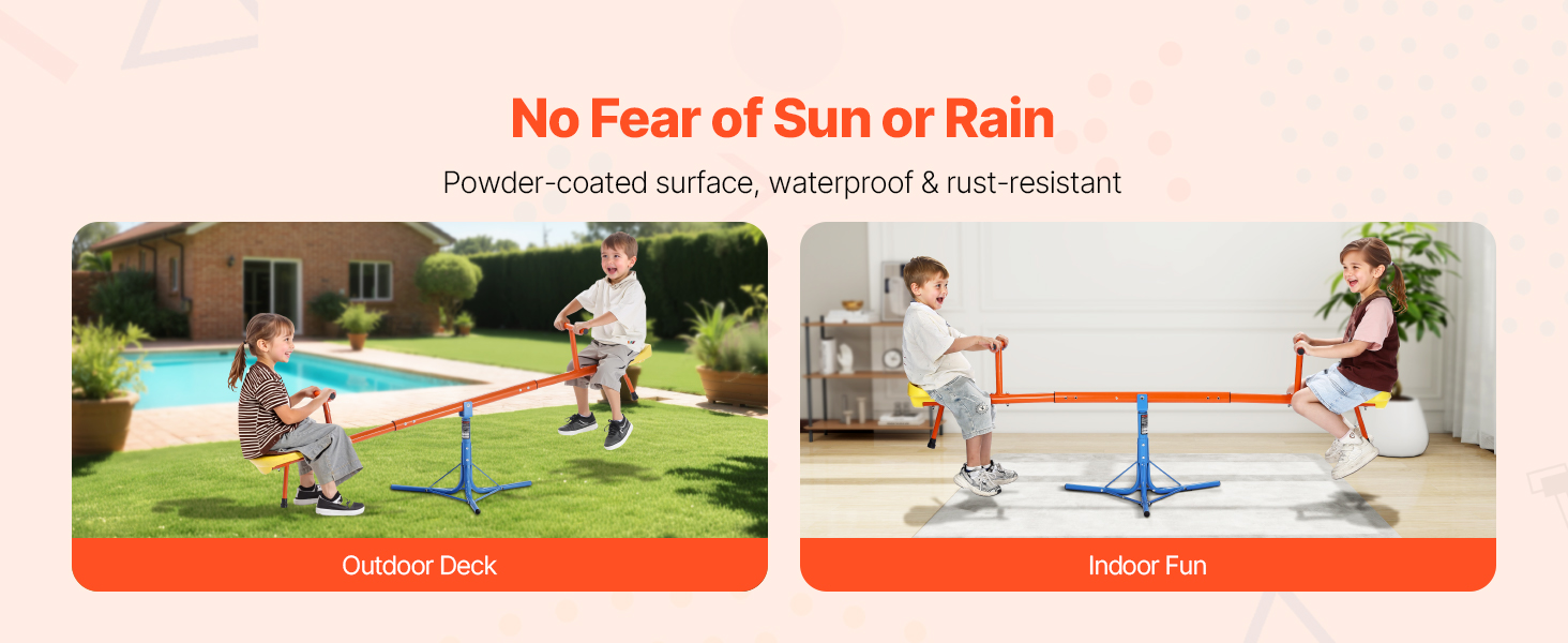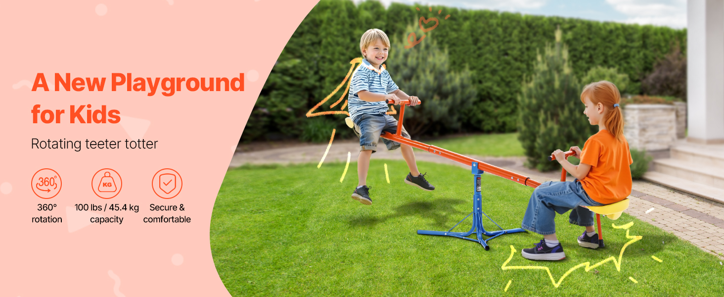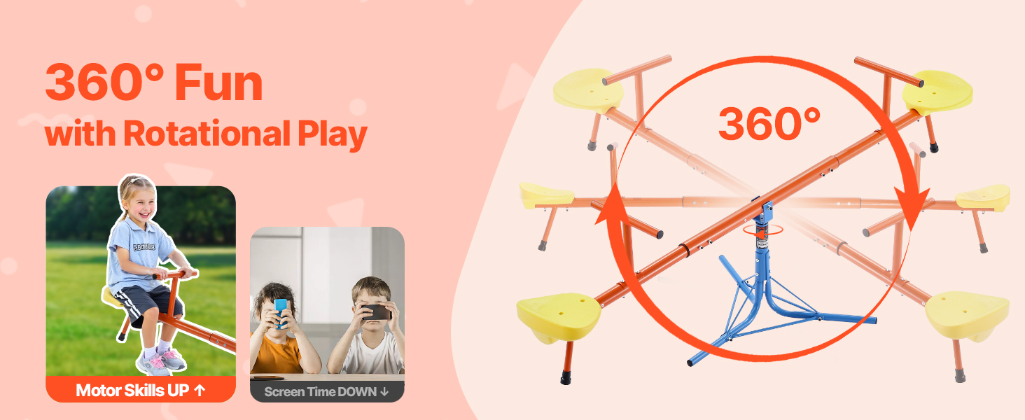 Vyrobené z odolnej uhlíkovej ocele, každé sedadlo unesie až 100 libier / 45,4 kg. Konštrukcia teeter totteru otáčajúca sa o 360° umožňuje deťom pri otáčaní skákať hore a dole, čo im dodáva zábavu a vzrušenie pri hre!