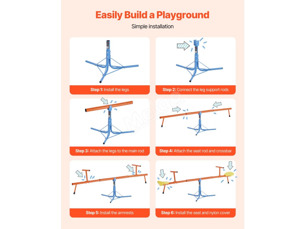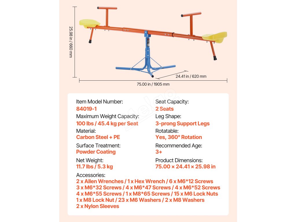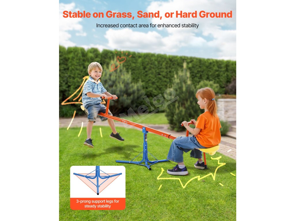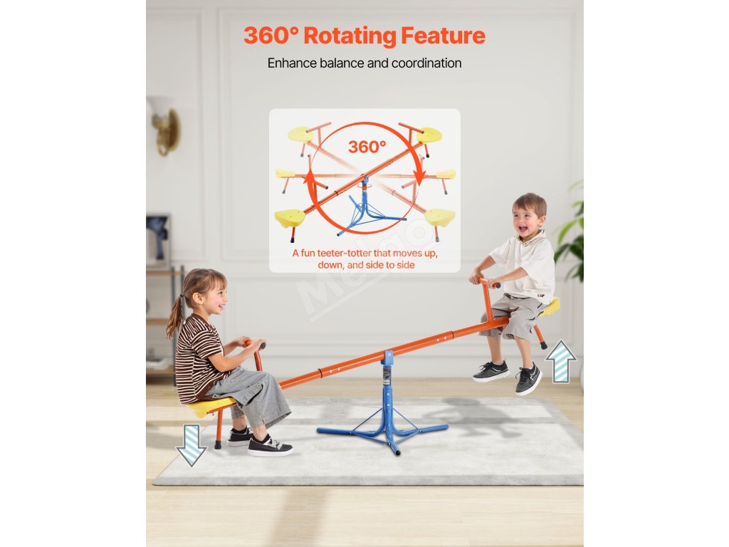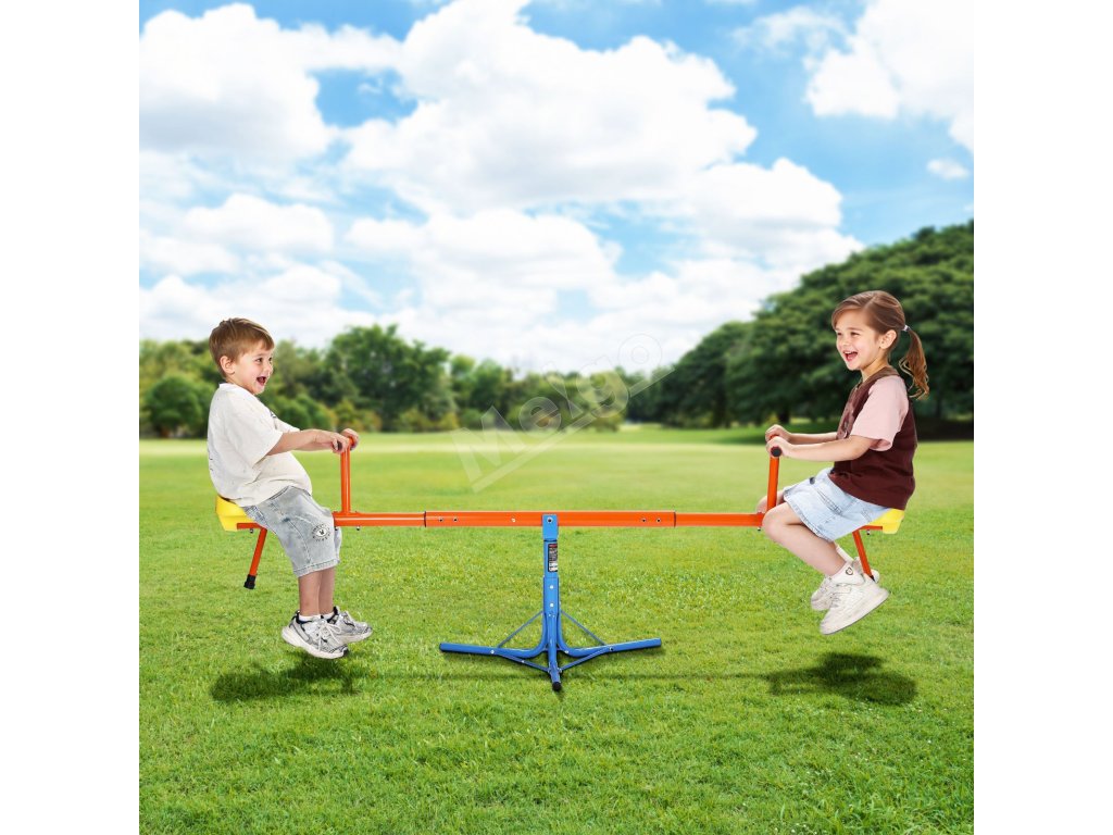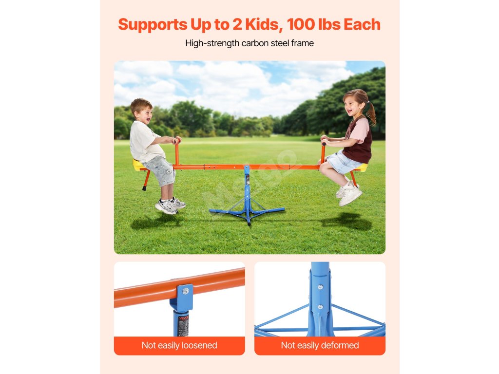 Vyrobené z odolnej uhlíkovej ocele, každé sedadlo unesie až 100 libier / 45,4 kg. Konštrukcia teeter totteru otáčajúca sa o 360° umožňuje deťom pri otáčaní skákať hore a dole, čo im dodáva zábavu a vzrušenie pri hre!