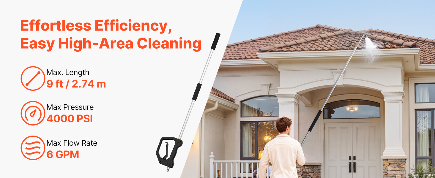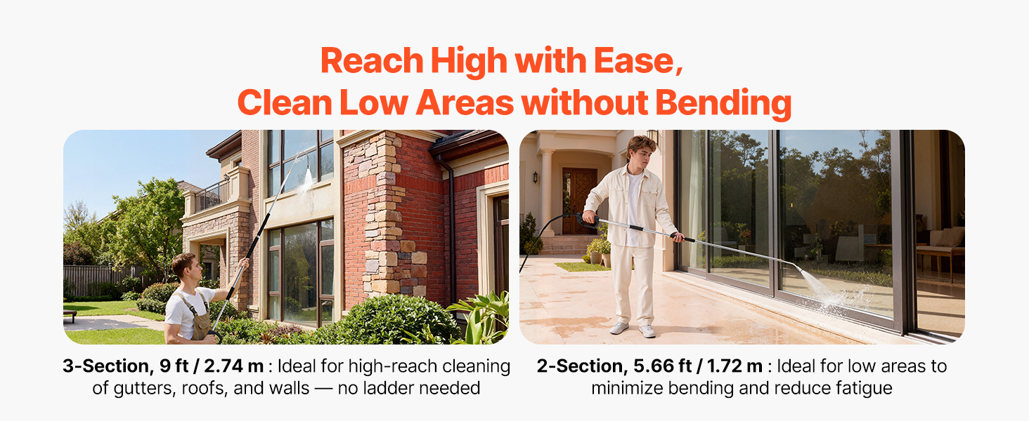 Táto teleskopická tryska vysokotlakového čističa je vybavená 3-dielnou predlžovacou tyčou pre flexibilnú montáž. Umožňuje vám bezpečne čistiť strechy, odkvapy, steny a okná zo zeme bez použitia rebríka.