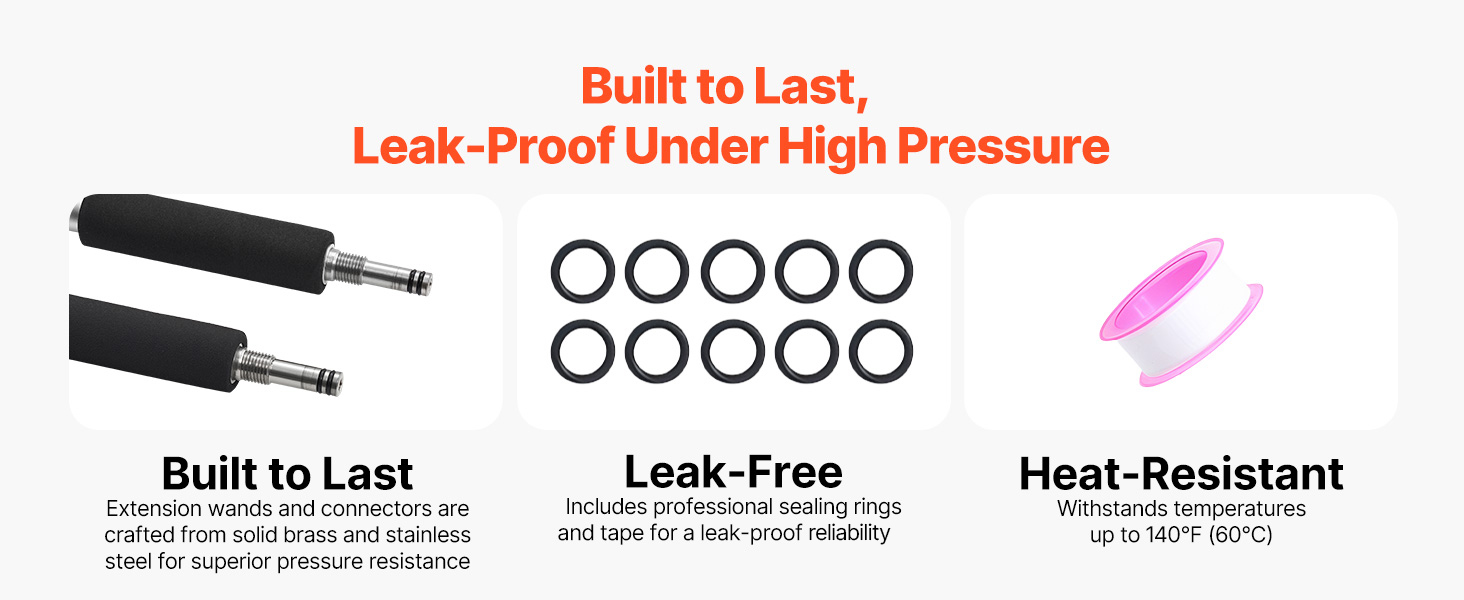Táto predlžovacia tyč je jednou z najspoľahlivejších predlžovacích tyčí pre vysokotlakové čističe a jej predlžovacie časti a spojky sú vyrobené z masívnej mosadze a nehrdzavejúcej ocele. Profesionálne tesniace krúžky a páska pomáhajú udržiavať tesné spojenia aj pri vysokom tlaku.