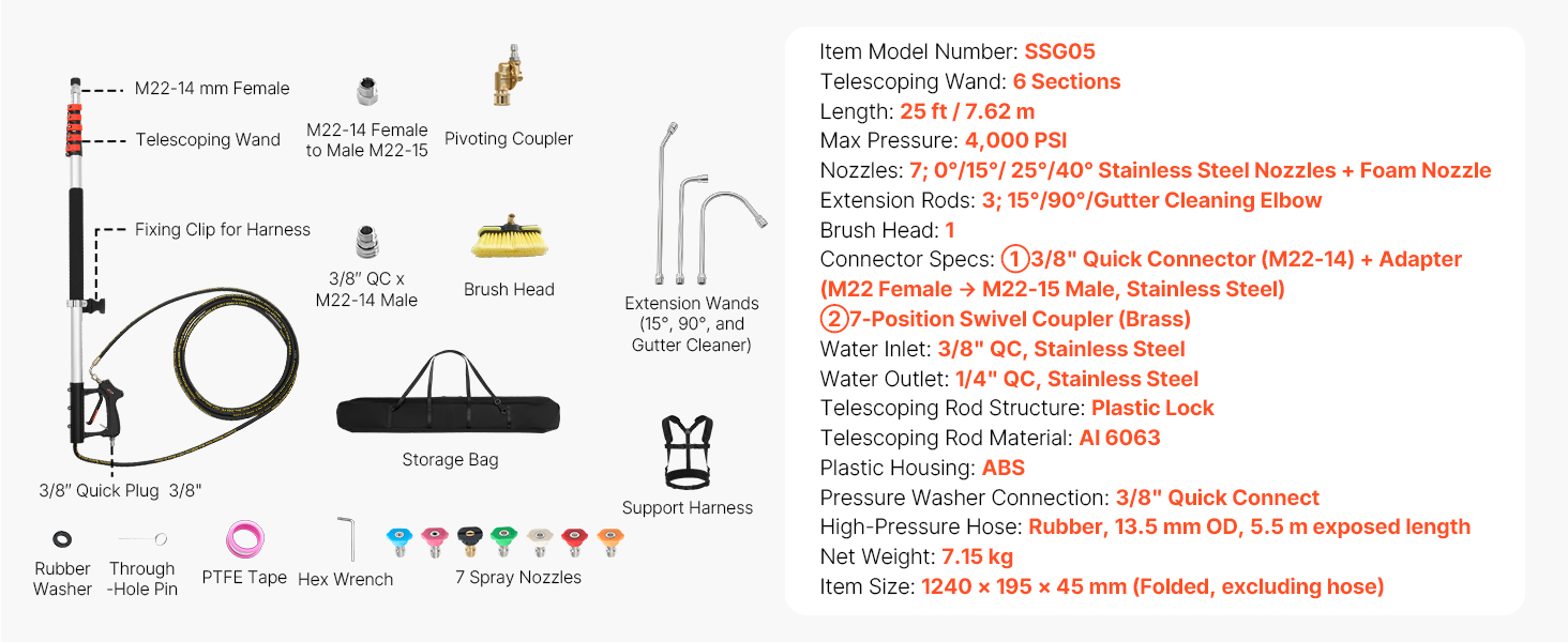 Je navrhnutá ako teleskopická tyč vysokotlakového čističa a je vybavená vystuženým pákovým zámkom pre plynulé nastavenie dĺžky a stabilné predĺženie. Môžete si tiež vybrať, či chcete nainštalovať otočnú spojku podľa svojich potrieb čistenia.