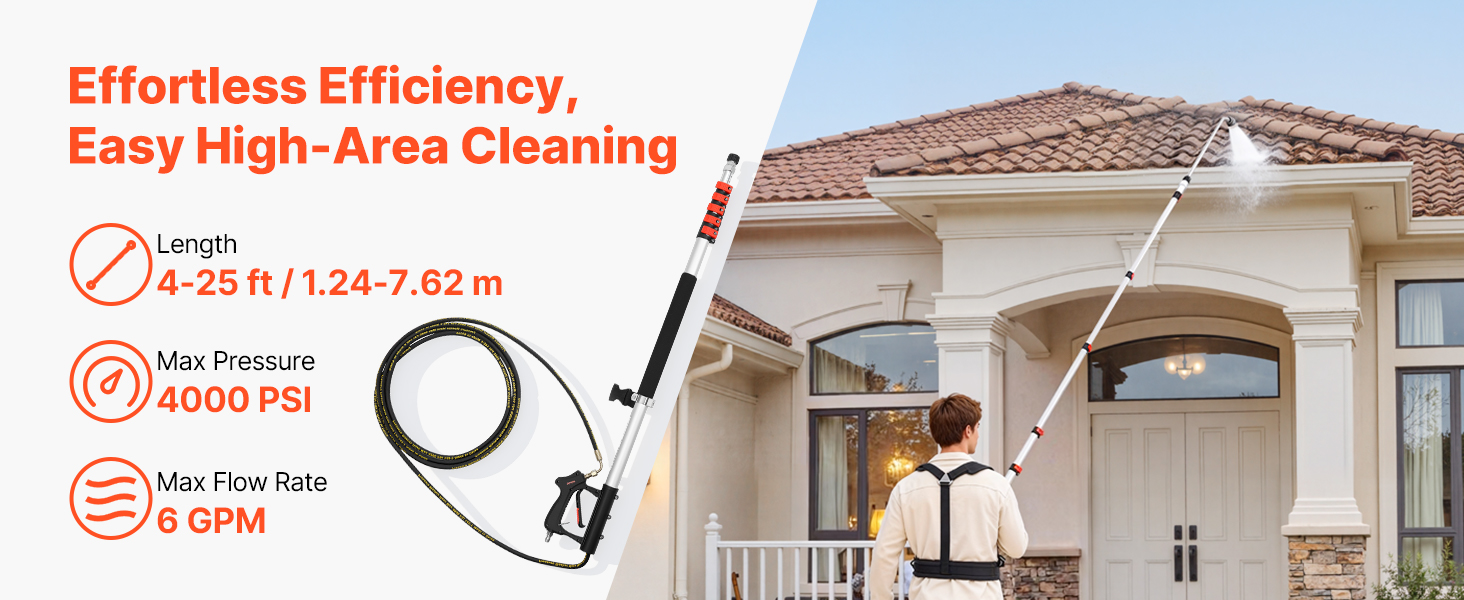 Táto teleskopická tryska vysokotlakového čističa uľahčuje čistenie striech, odkvapov, stien a okien bez použitia rebríka, čím zvyšuje efektivitu a zároveň znižuje fyzickú námahu.
