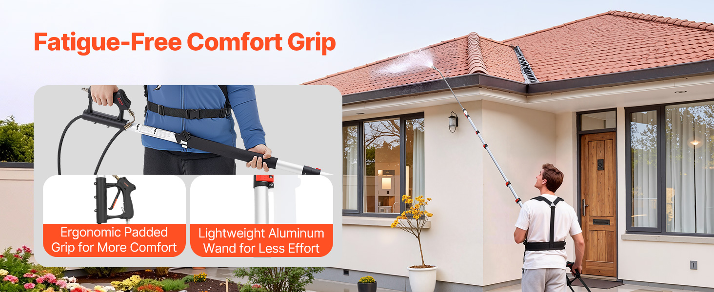 Ľahká hliníková tyč, navrhnutá ako jedna z praktických predlžovacích tyčí vysokotlakového čističa, umožňuje jednoduchú manipuláciu pri dlhodobom používaní, zatiaľ čo ergonomicky polstrovaná rukoväť zvyšuje pohodlie a kontrolu.